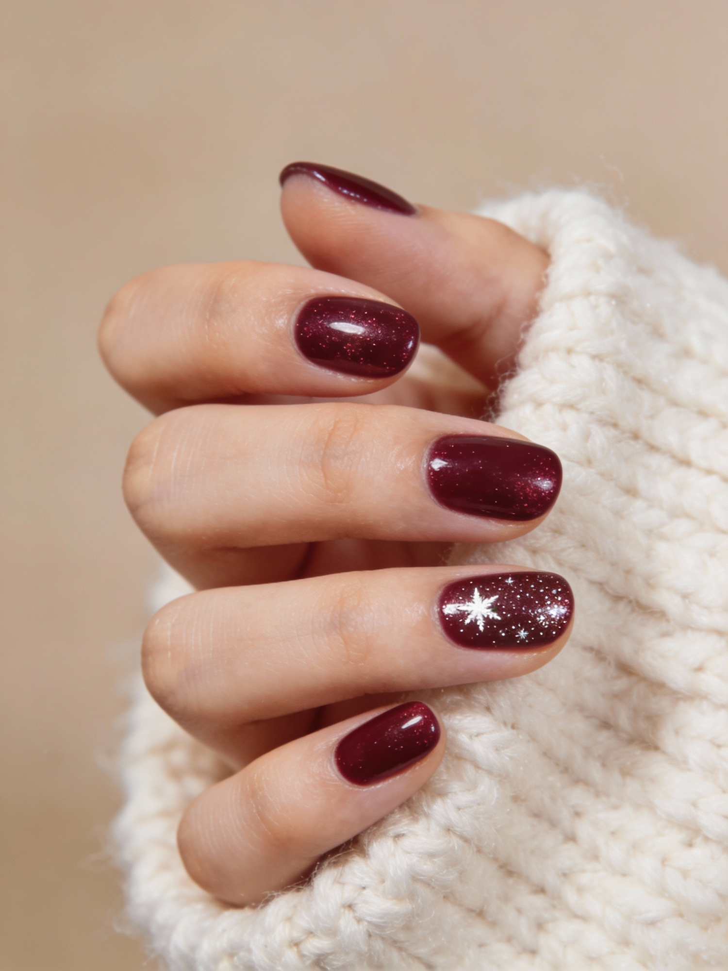 Macro beauty shot of short rounded nails in deep berry shimmer polish, one accent nail with a tiny white star/snow sparkle, cozy cream knit sleeve, soft diffused lighting, neutral beige background, clean winter editorial look.
