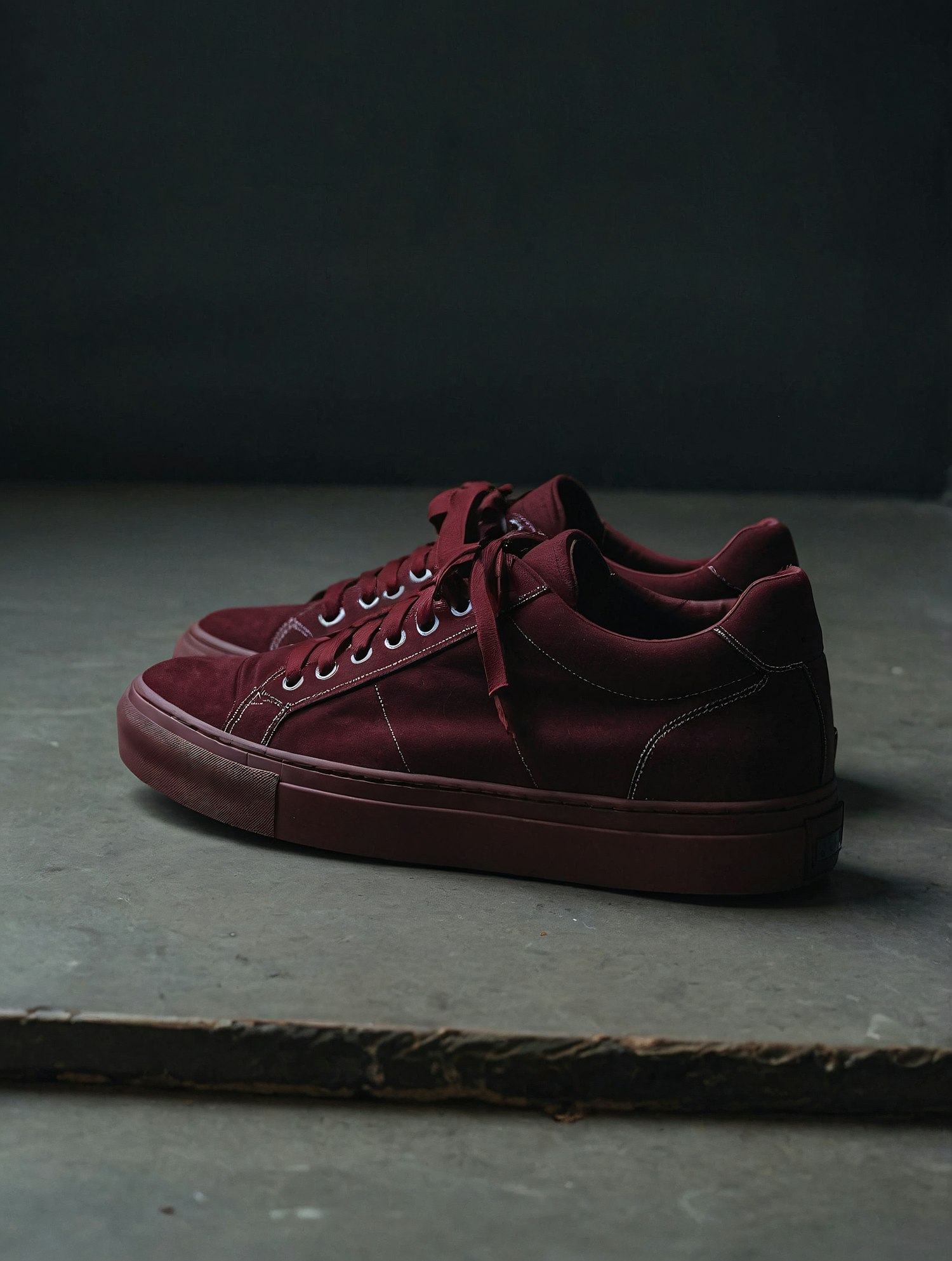 Burgundy suede sneakers with white stitching on a concrete floor, set against a dark, moody background for a minimalist aesthetic.