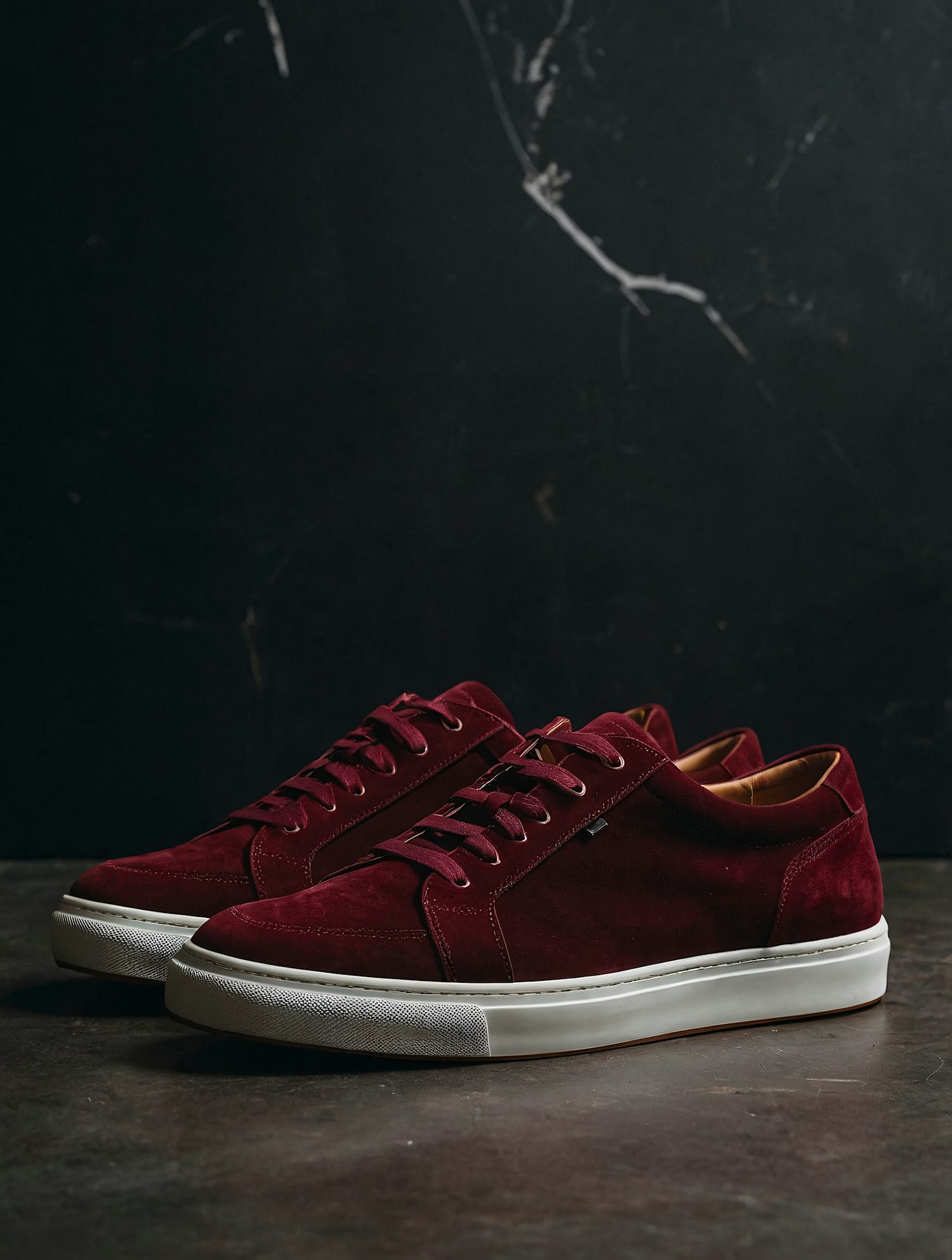 Elegant burgundy suede sneakers with white soles, perfect for a modern and stylish look. Great for casual or semi-formal outfits.