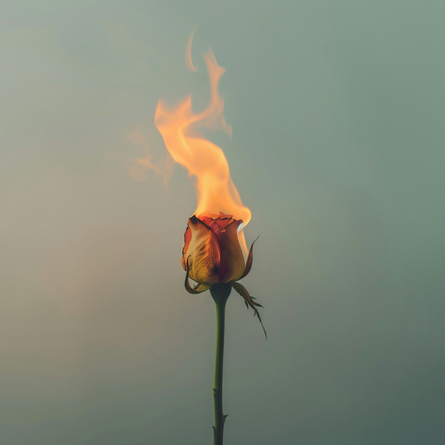 A dramatic image of a single rose on fire, with vivid flames against a muted gray-green background. Perfect for symbolic or artistic themes.
