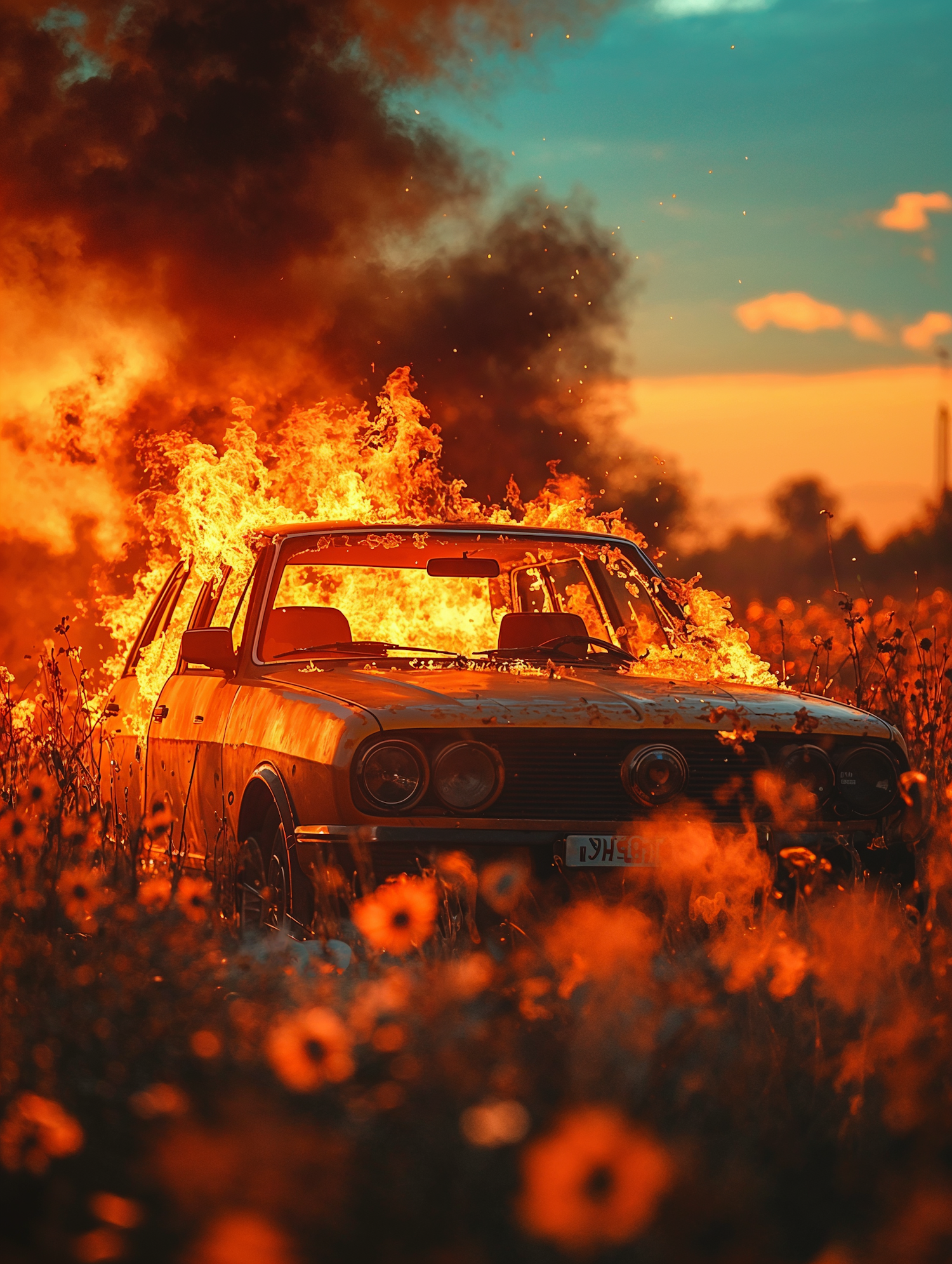 A burning vintage car in a field of orange flowers under a dramatic sunset, with flames and smoke creating a surreal, apocalyptic vibe.