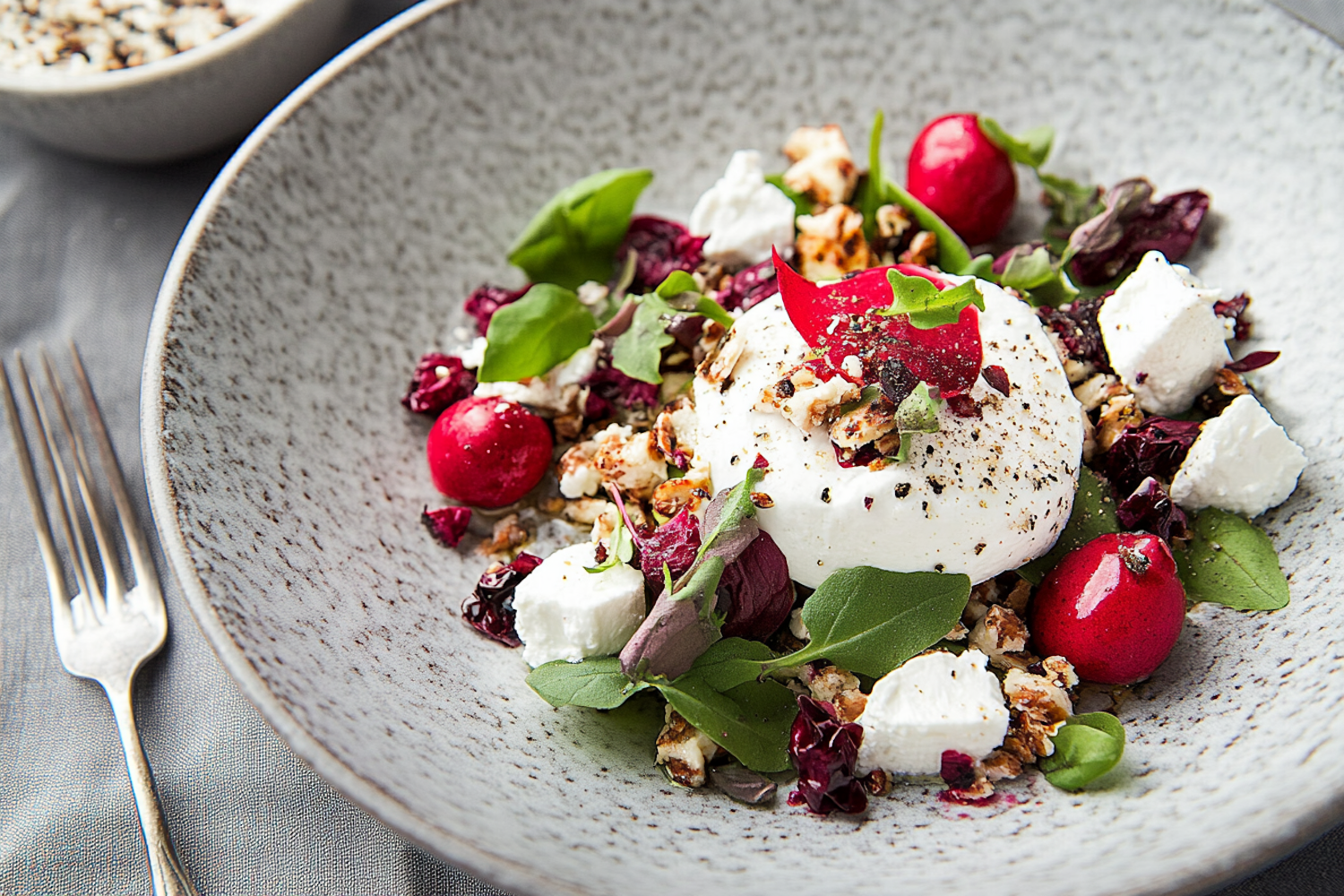 Creamy burrata with radishes, arugula, feta, granola, and cranberries on a speckled plate. A perfect mix of textures and flavors!