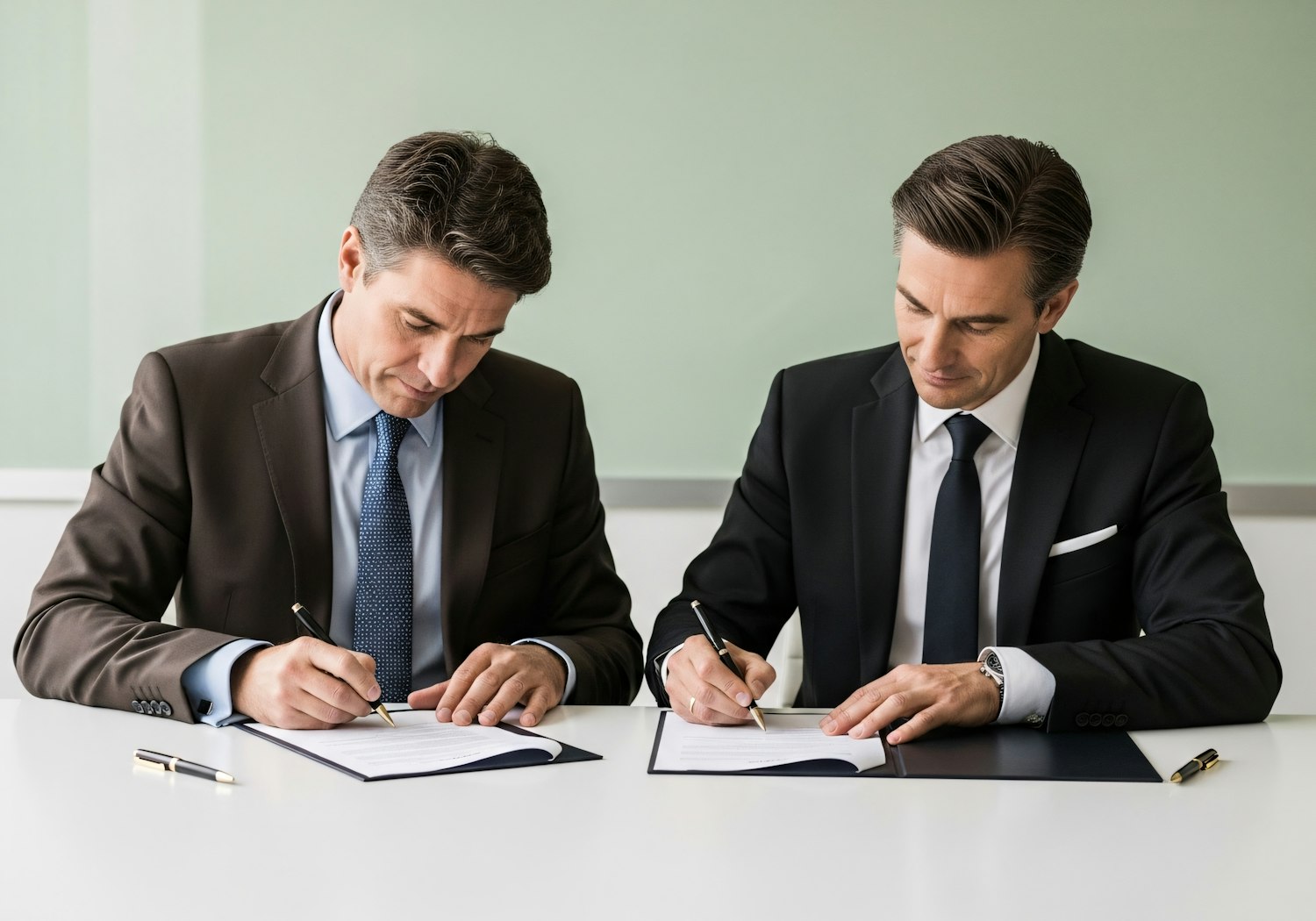 Two businessmen in formal suits signing documents at a table, focused and professional in a clean, light-colored office setting.