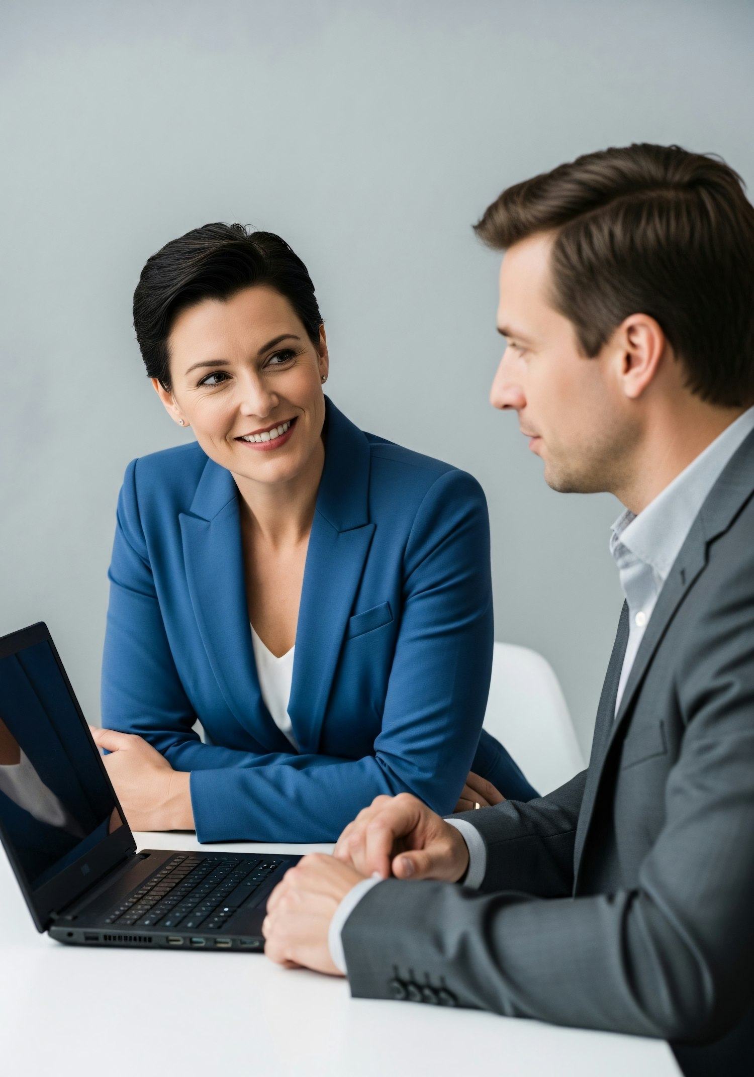 Two professionals in a business meeting, discussing ideas with a laptop on the table, fostering collaboration and teamwork.