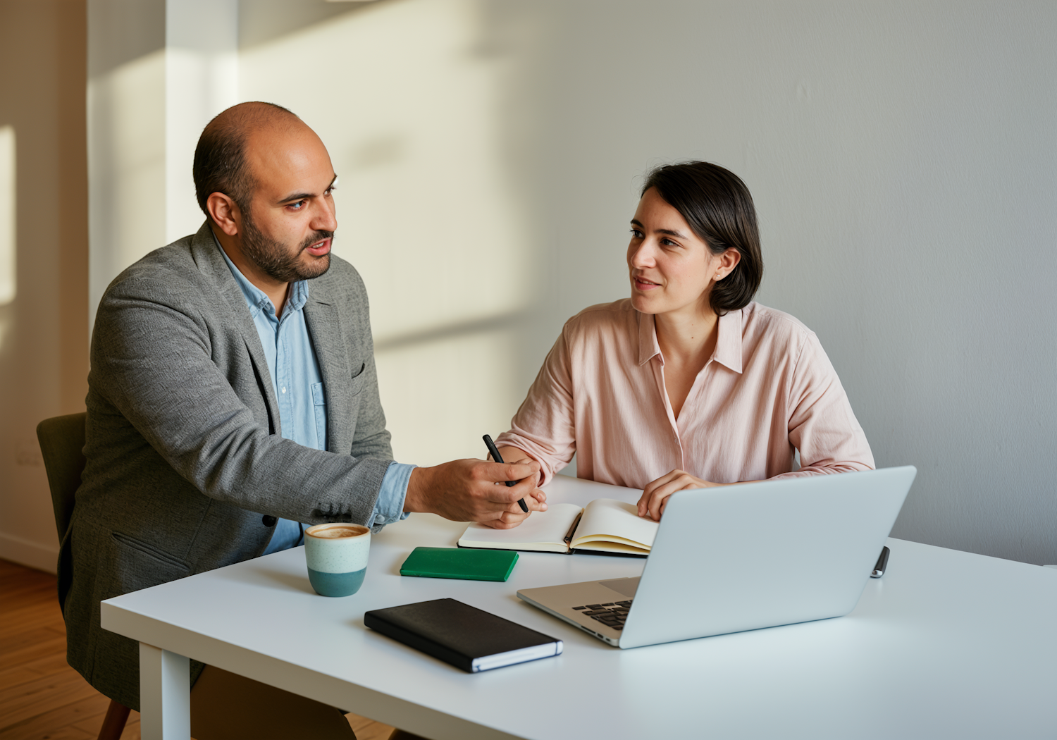 Two colleagues discussing work at a table with a laptop, notebooks, and coffee, in a bright and professional setting.