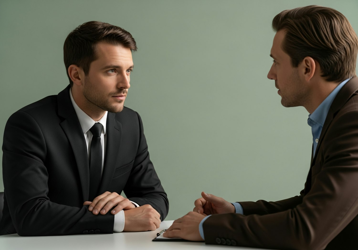 Two men in formal attire engaged in a professional discussion at a table, set against a plain green background.