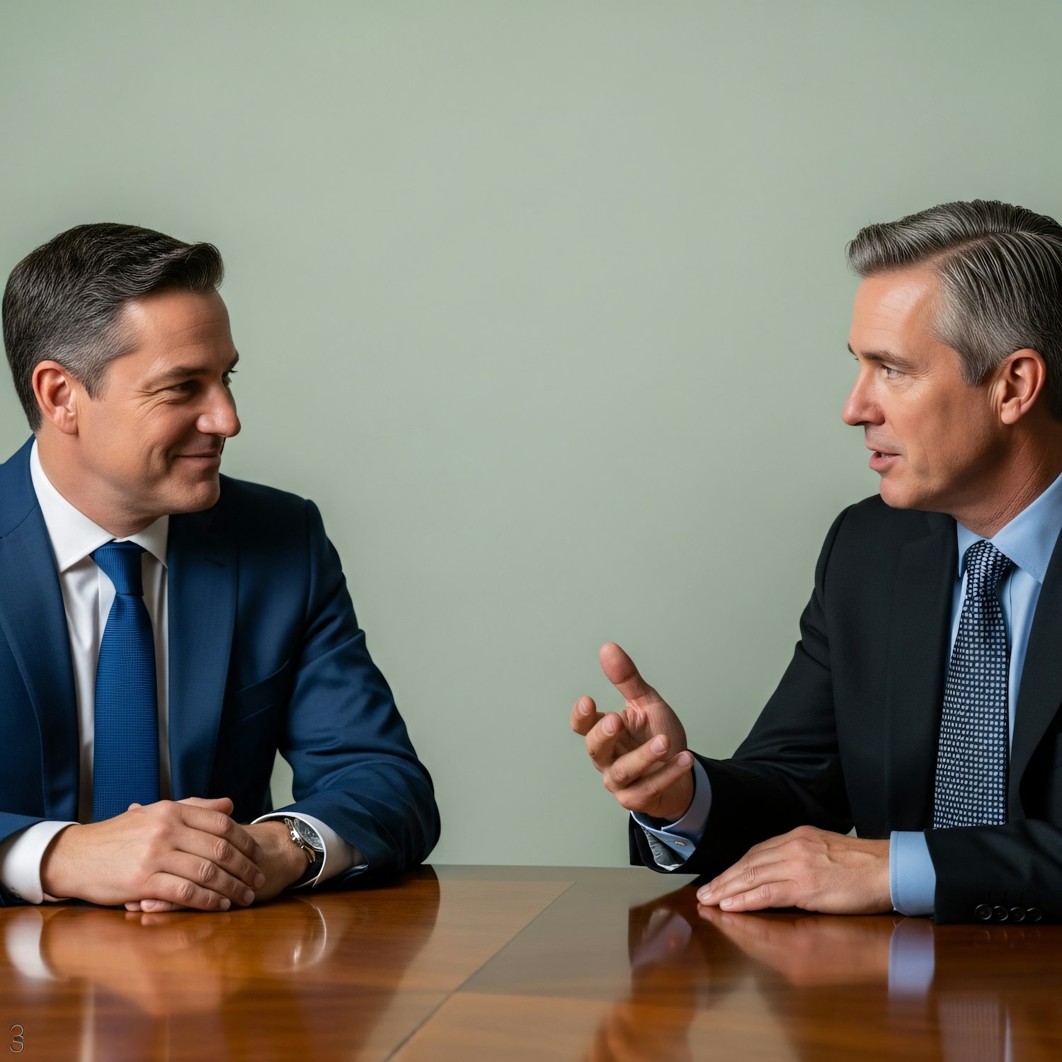 Two businessmen in formal attire having a discussion at a polished wooden table, set against a plain background.