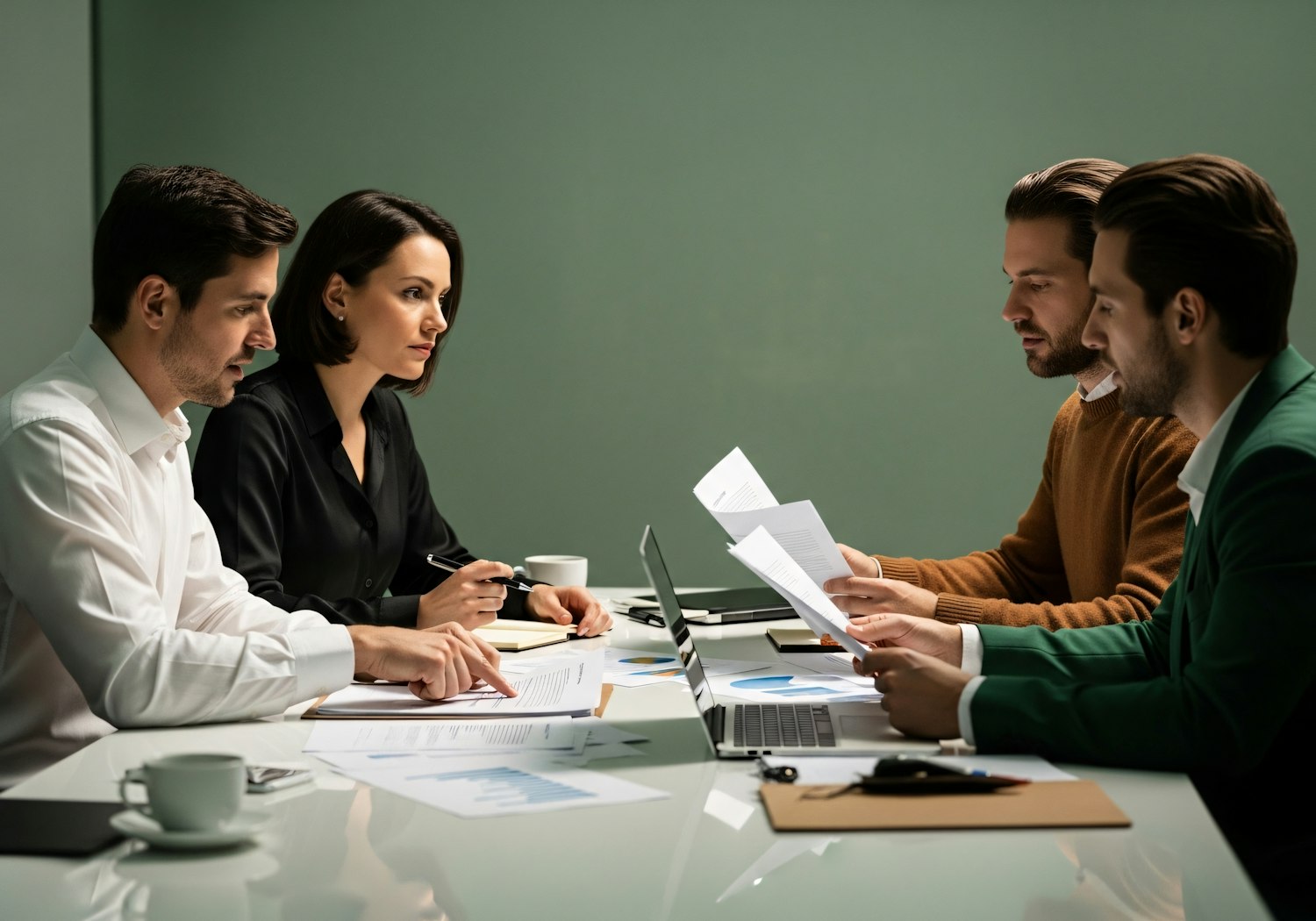A professional meeting with four individuals discussing documents and data at a table, showcasing teamwork and collaboration.