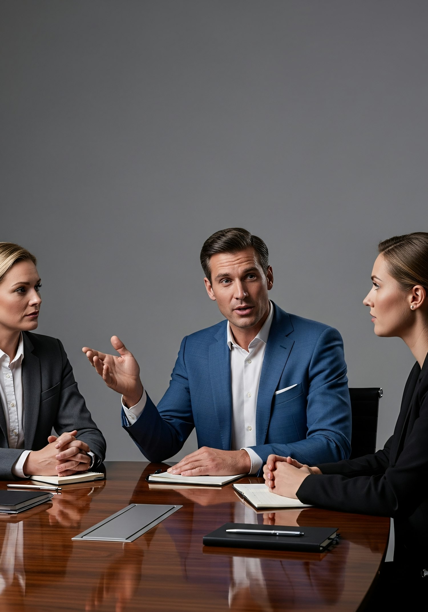 Three professionals in formal attire engaged in a discussion at a conference table, with notebooks and pens on the polished surface.