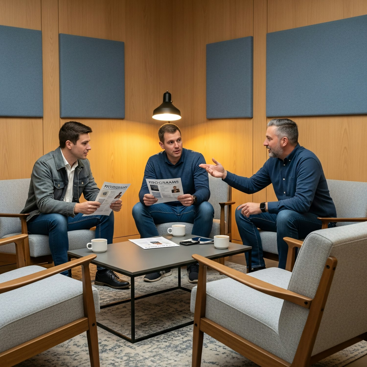 Three men in a modern meeting room discussing printed materials, seated around a coffee table with a warm and professional ambiance.