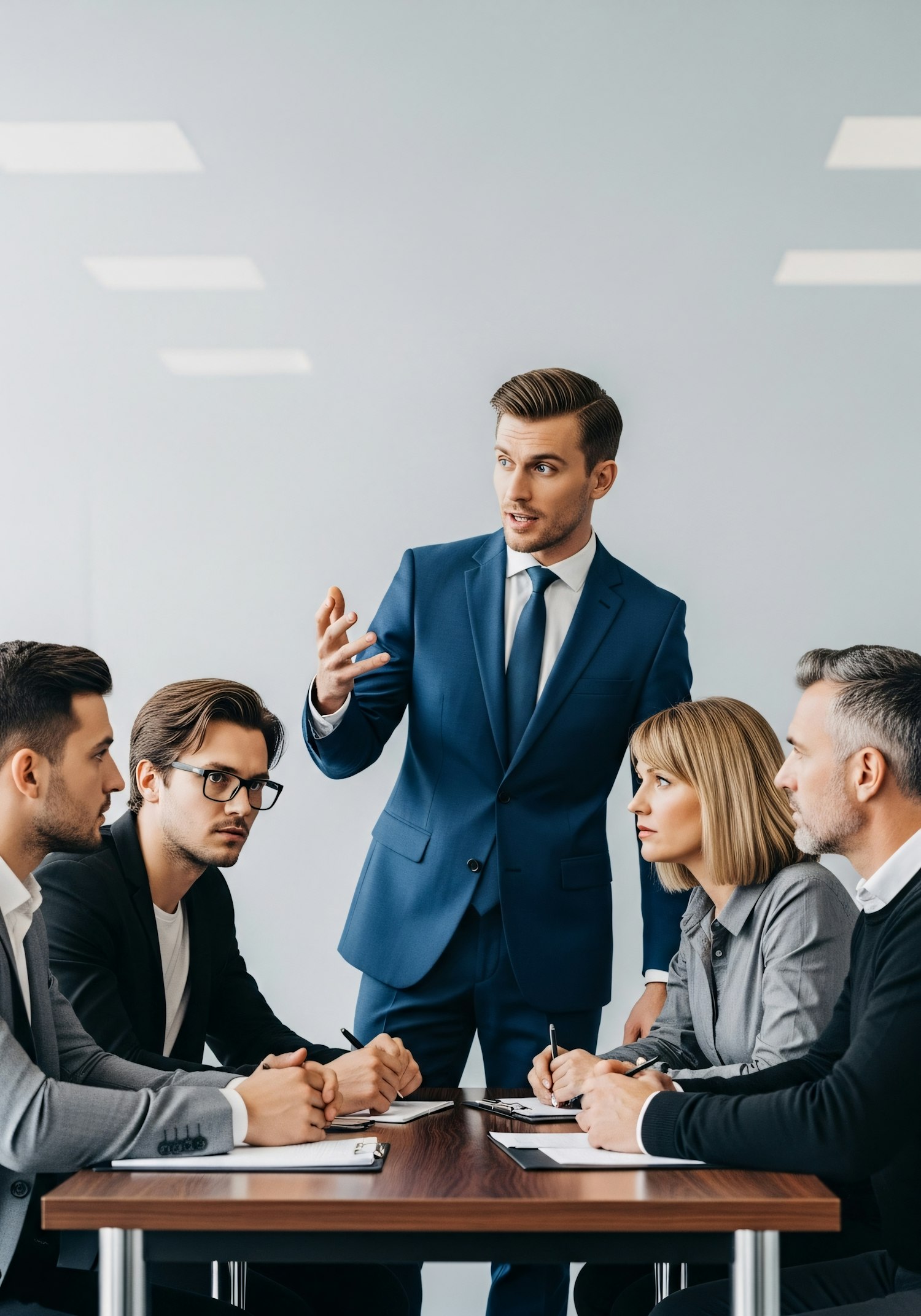 A business meeting with a leader presenting to a group of professionals seated at a table in a modern office setting.