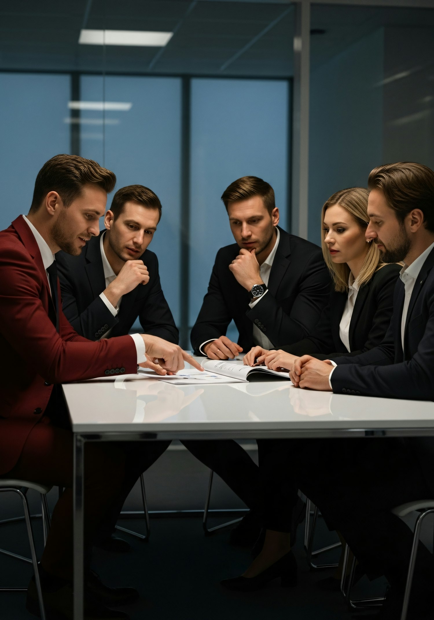 A team of professionals in a modern office discussing documents at a conference table, showcasing collaboration and focus.