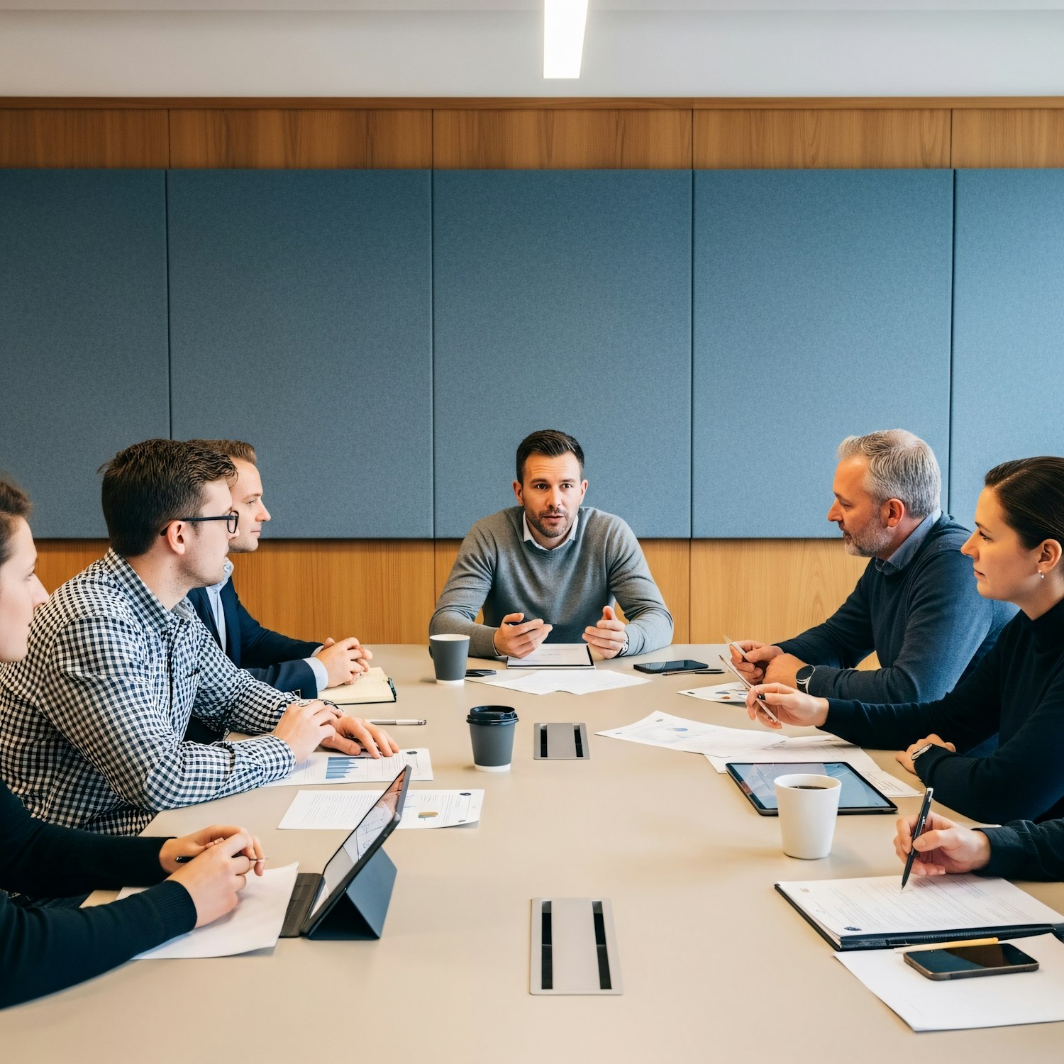 A professional team engaged in a collaborative meeting around a modern conference table, discussing documents and ideas.