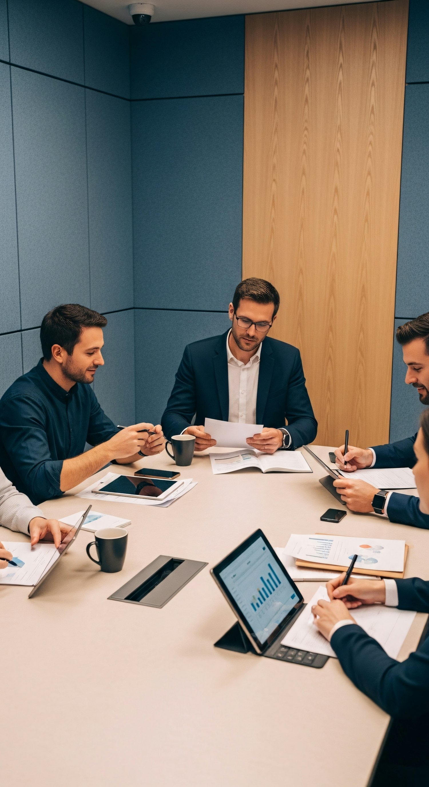 Team of professionals collaborating in a modern office, reviewing documents and data on tablets during a meeting.