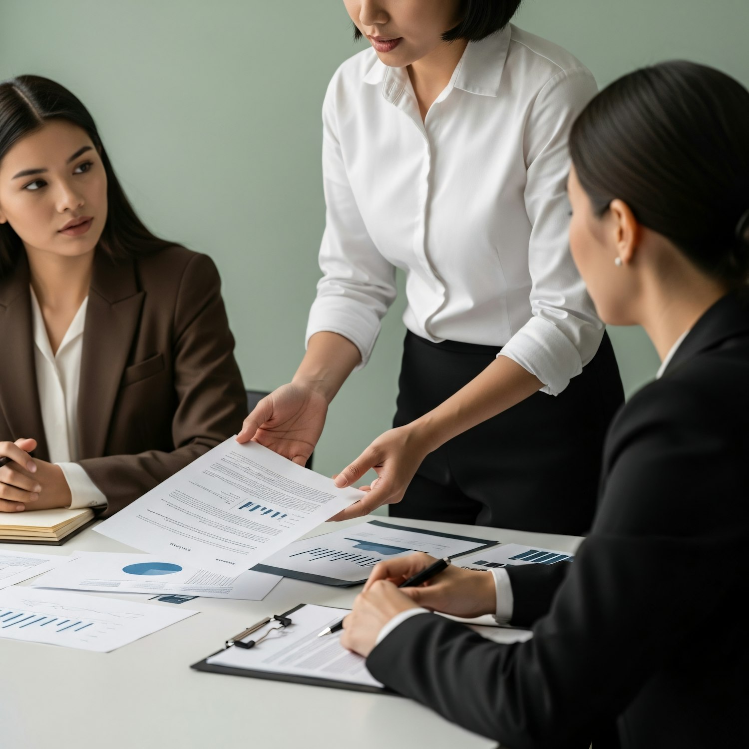 Three professionals in a meeting, discussing documents and charts on a table, showcasing a collaborative business environment.