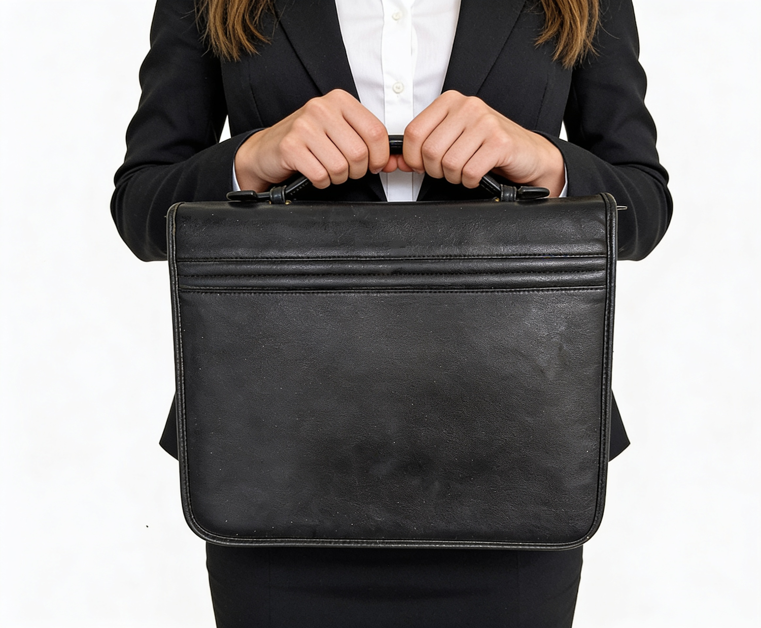 A professional holding a black leather briefcase, dressed in formal attire against a plain white background.