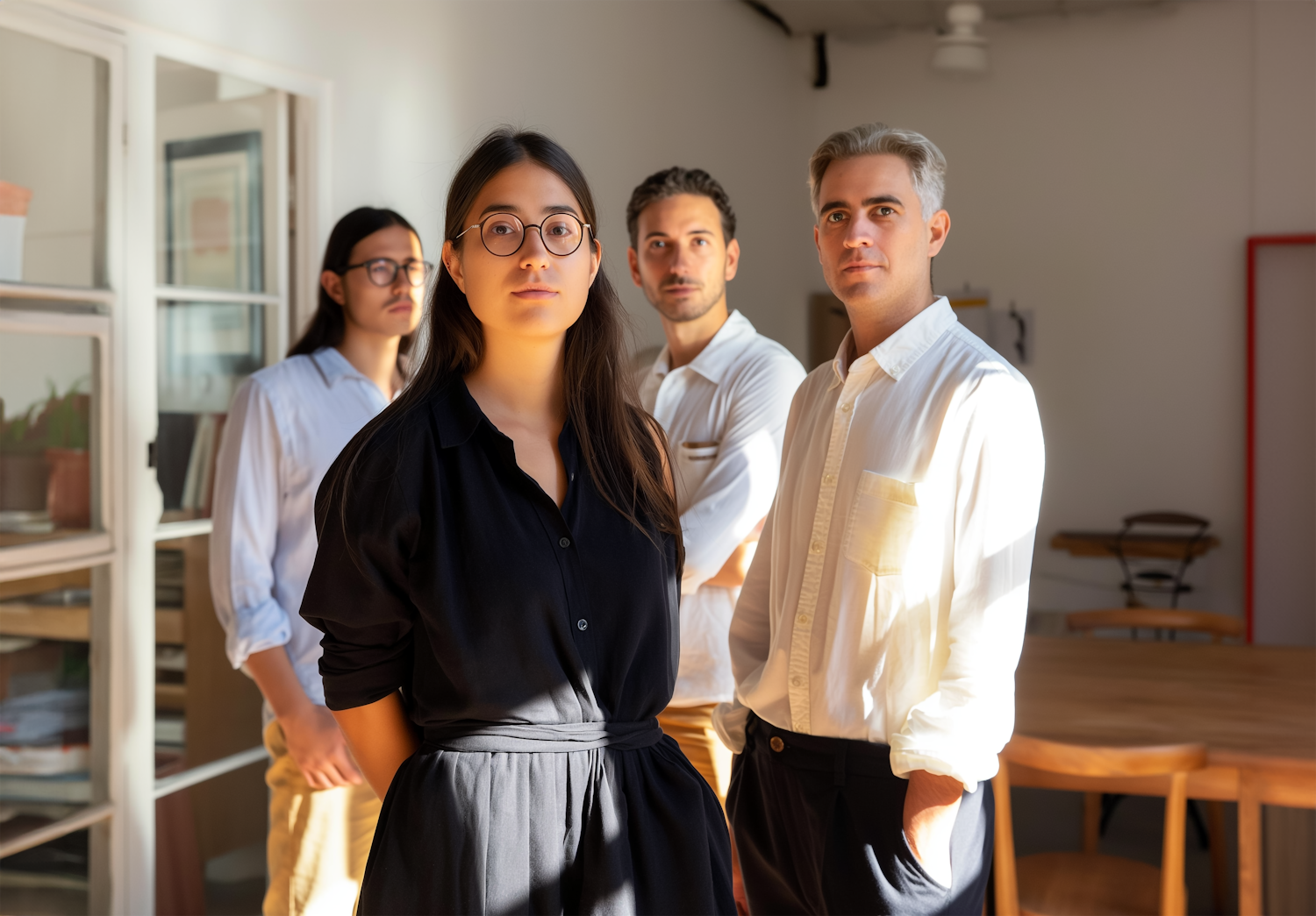 A diverse group of professionals in a sunlit office, exuding confidence and teamwork. Modern and minimalist setting.