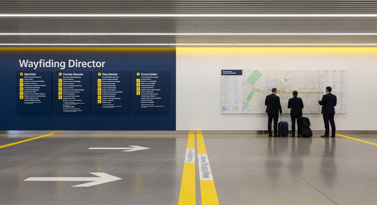 Three business professionals examine a wayfinding map in a modern indoor space, with clear signage and polished concrete flooring.
