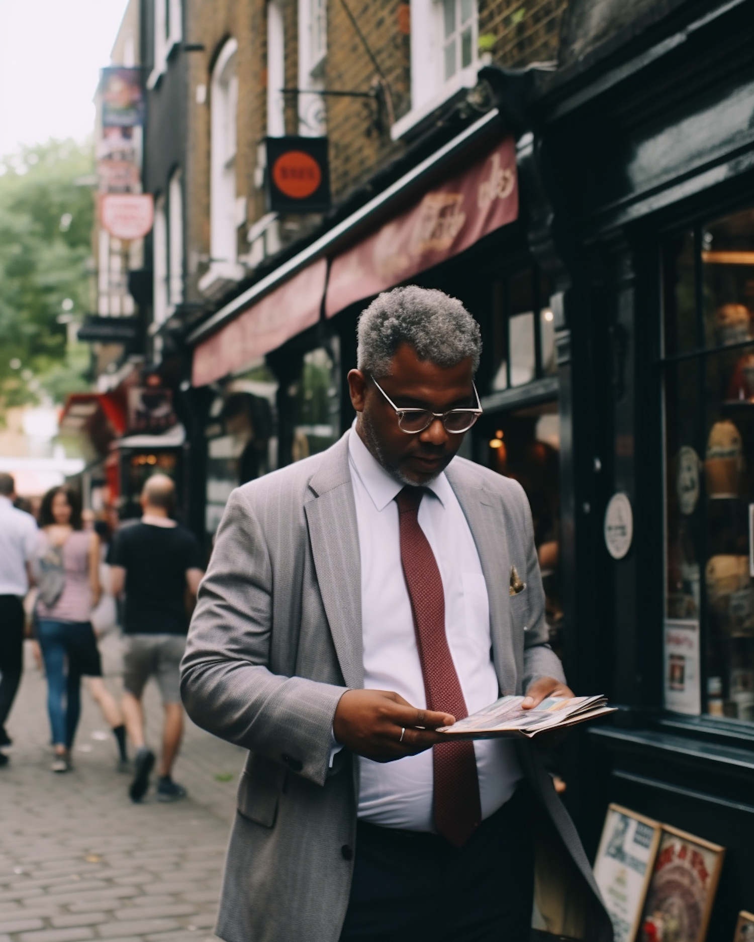 A man in a gray suit reads a newspaper while walking down a lively street lined with shops and people.