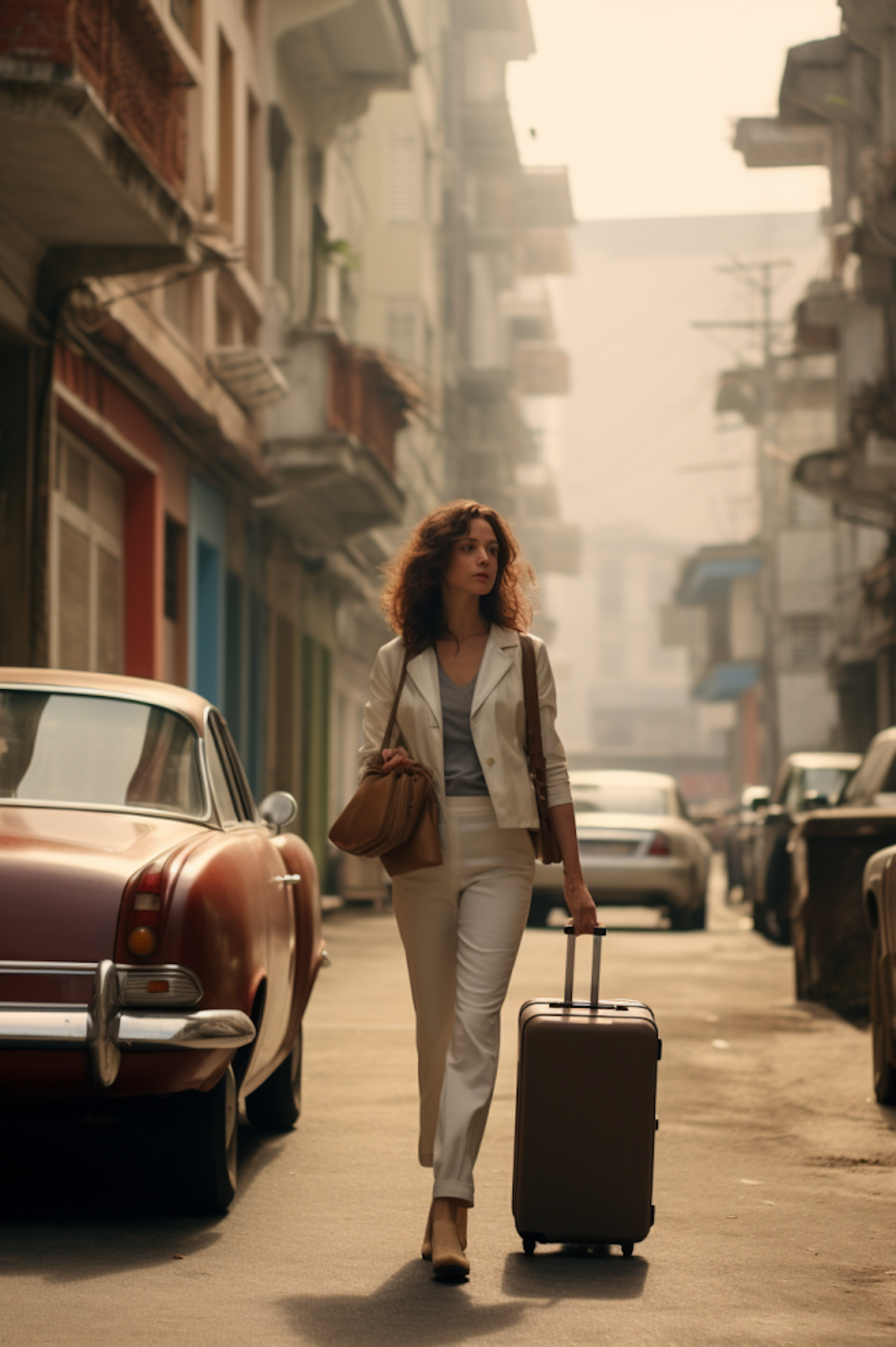 Woman in white suit walking down urban street with suitcase, vintage car nearby, warm lighting, and old buildings in the background.