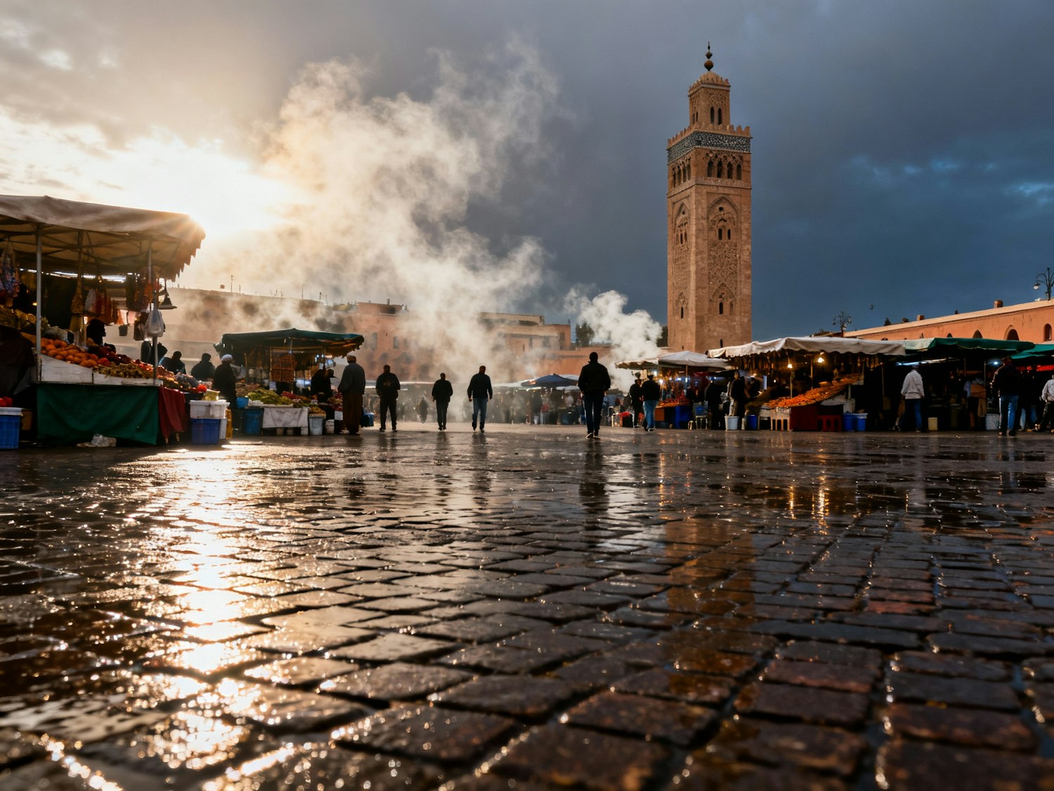 Marrakech, Morocco — Jemaa el-Fnaa square with Koutoubia Mosque in view; post-storm clearing; camera-left sun; neutral-warm 5400–5700 K; wet cobbles and stalls catching highlights; light steam/haze lifting. 24 mm, f/7.1, ISO 100, 1/250 s; CPL to deepen sky—light rotation. Negative: orange cast, over-clarity, halo edges, HDR glow.