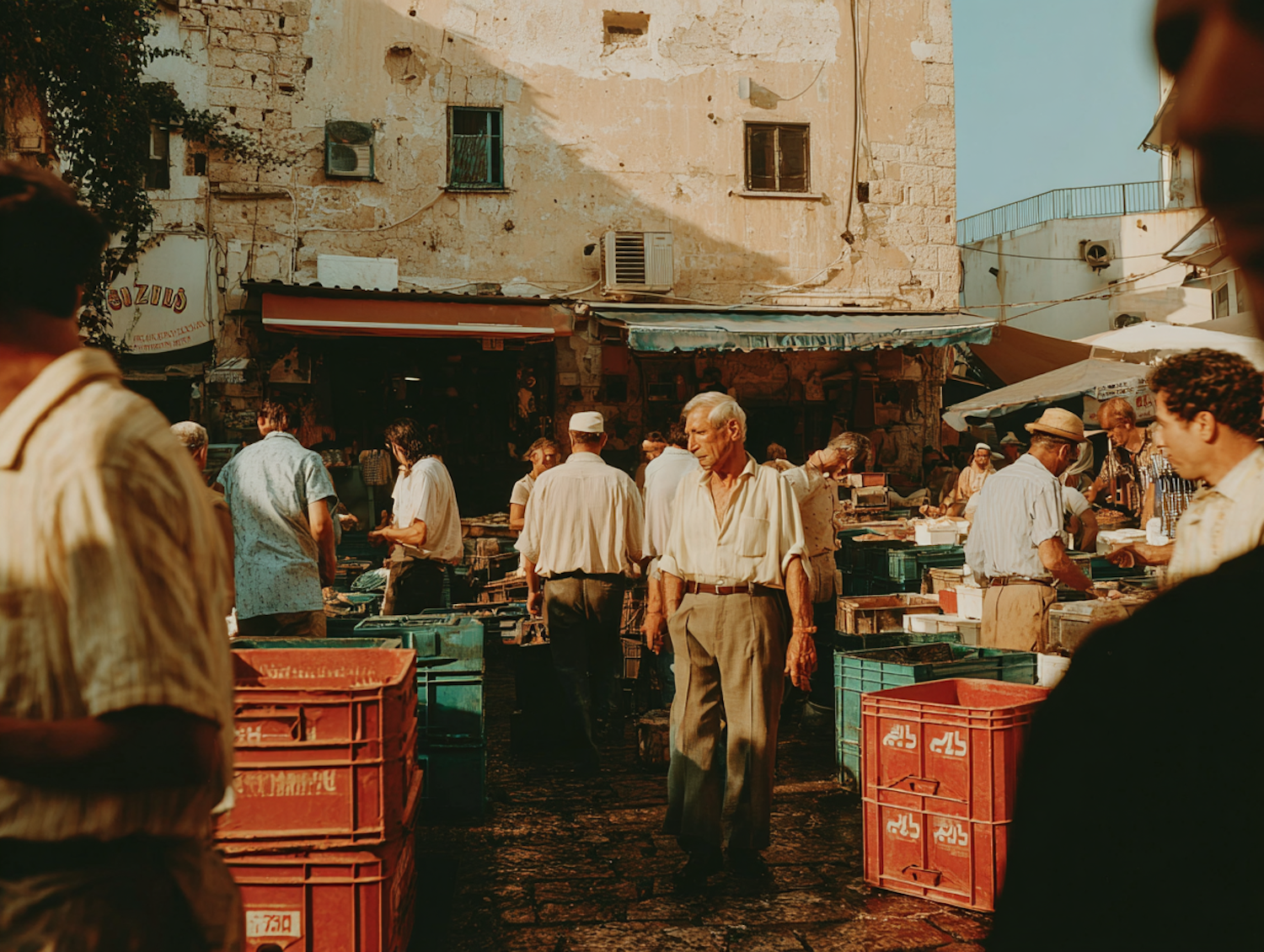 A vibrant outdoor market scene with people shopping and interacting, surrounded by crates and aged buildings under warm sunlight.