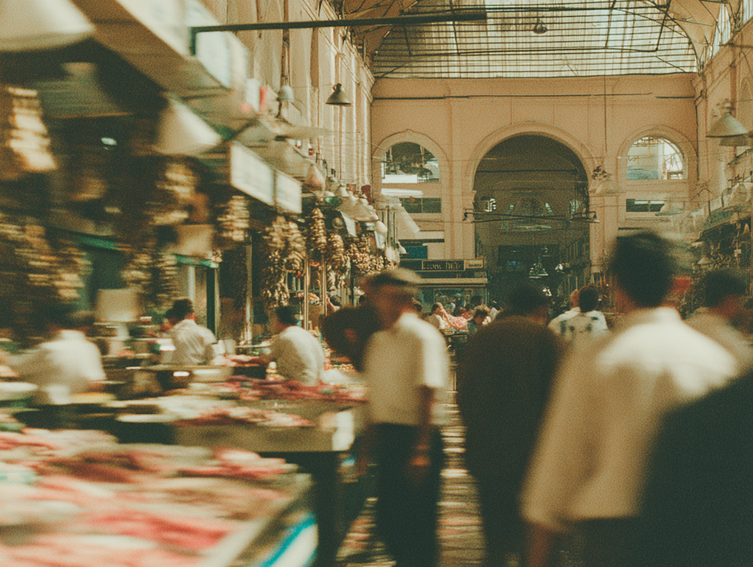 A lively indoor market with people browsing stalls under high arched ceilings, showcasing a vibrant and bustling atmosphere.