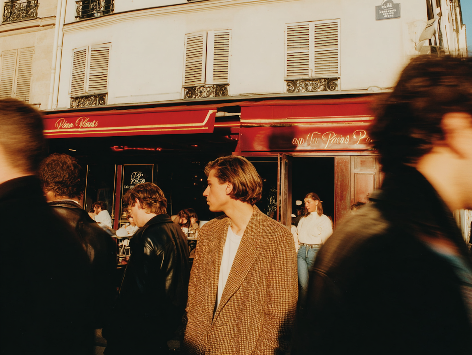 A lively street scene with people in motion, a stylish café backdrop, and warm lighting creating a nostalgic urban atmosphere.