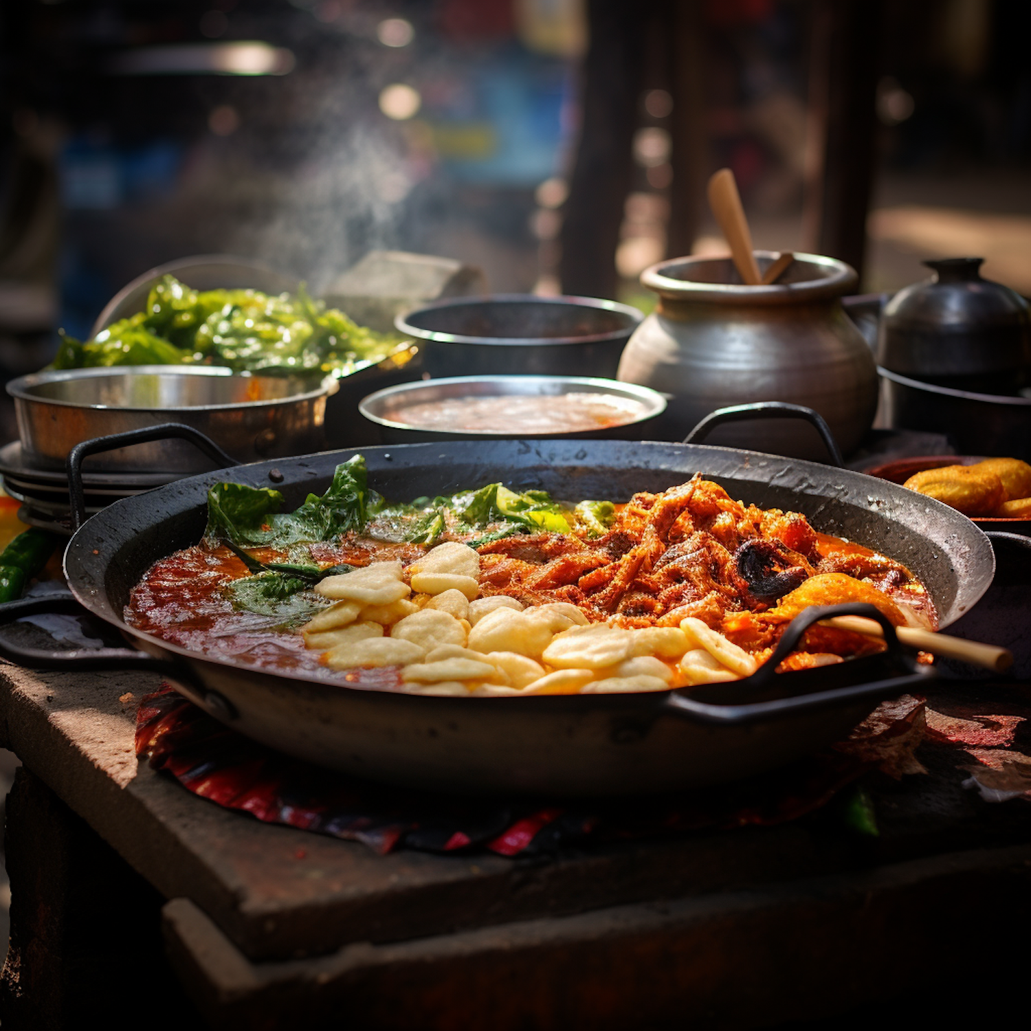 A vibrant, spicy stew with greens and fried dough in a large pan, surrounded by pots, on an outdoor stove.