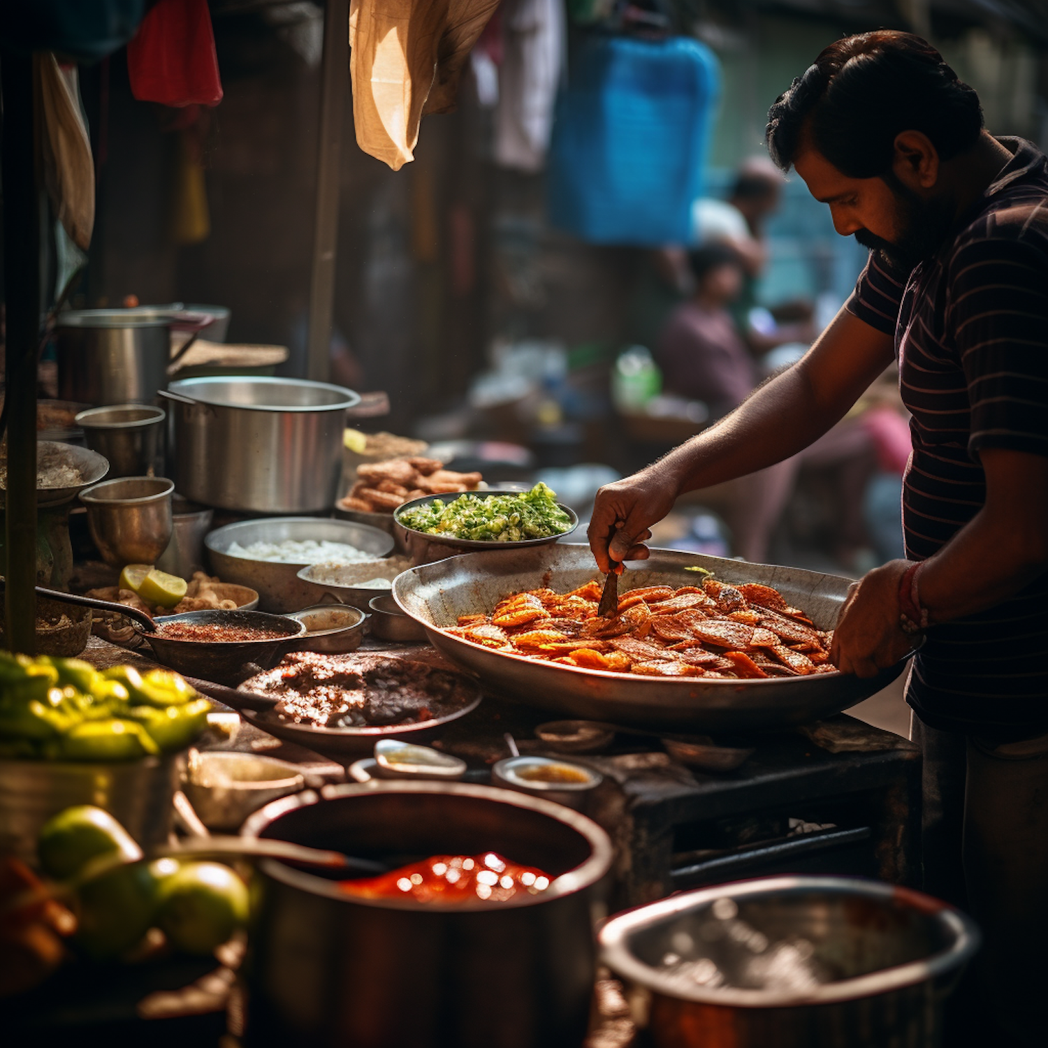 Street food vendor frying snacks at a bustling market stall, surrounded by colorful ingredients and warm lighting.