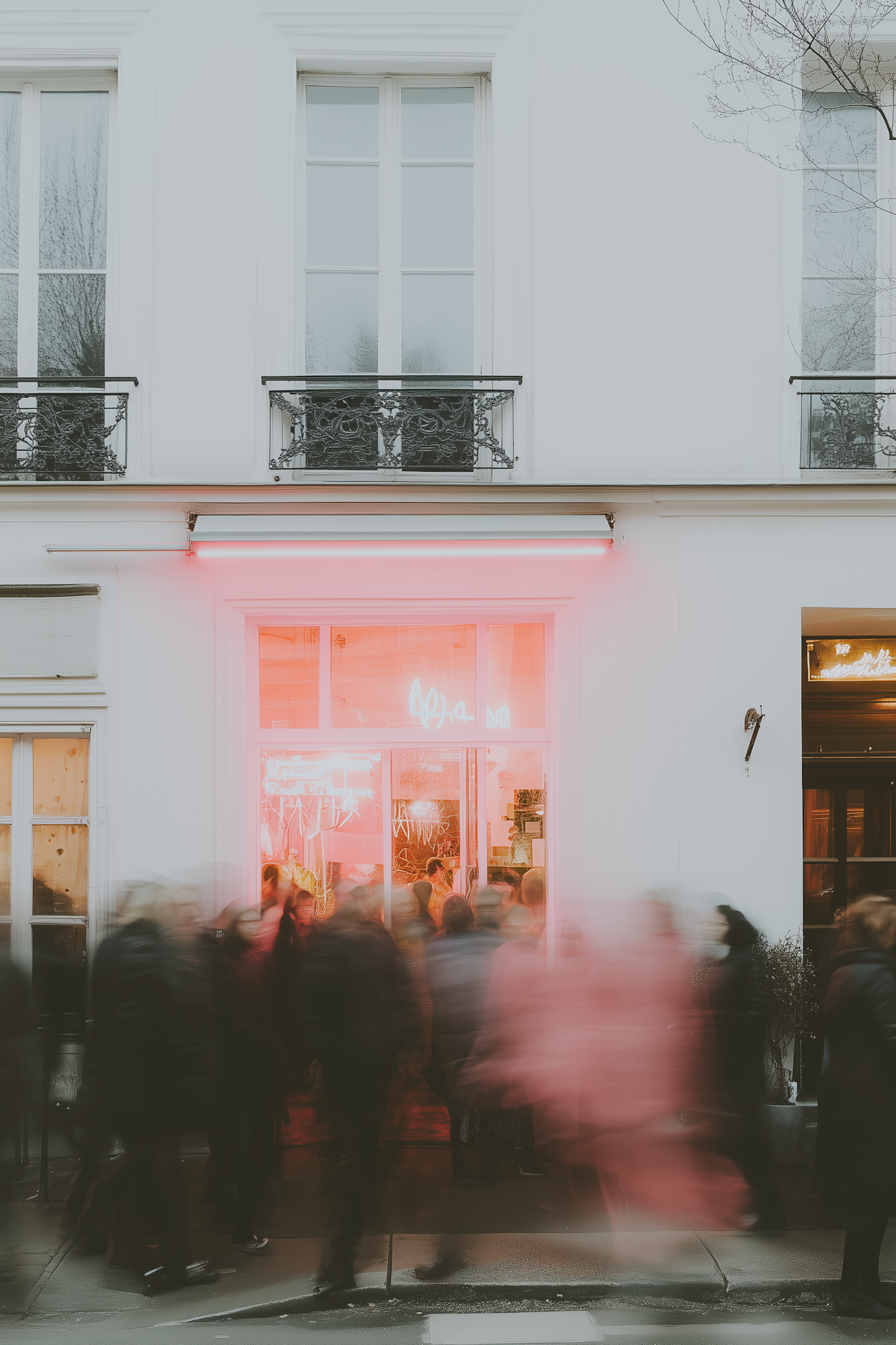 A vibrant storefront with pink neon lights and blurred pedestrians passing by, creating a dynamic and lively urban scene.