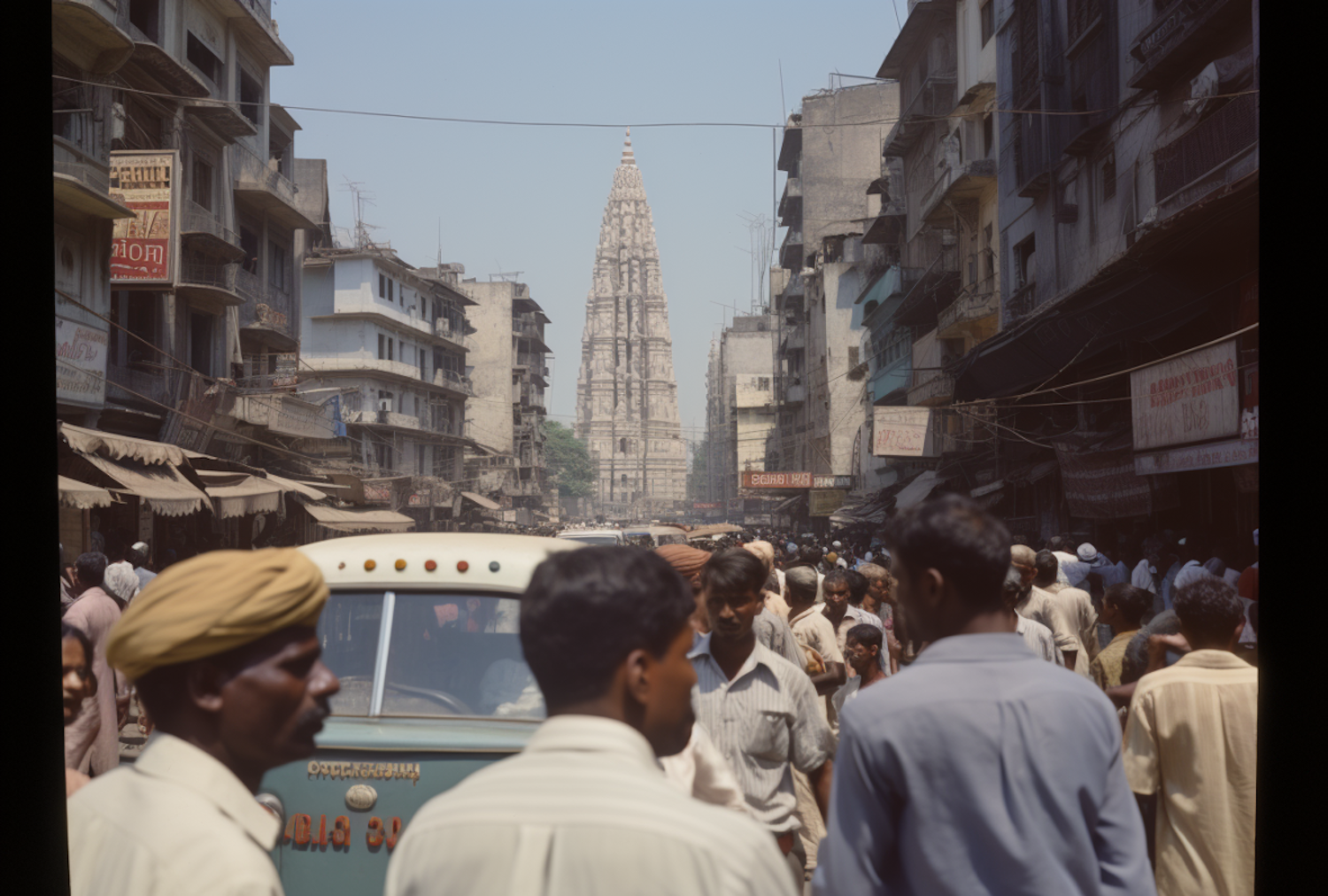 Busy urban street with a temple tower in the background, crowded with people and lined with old buildings.