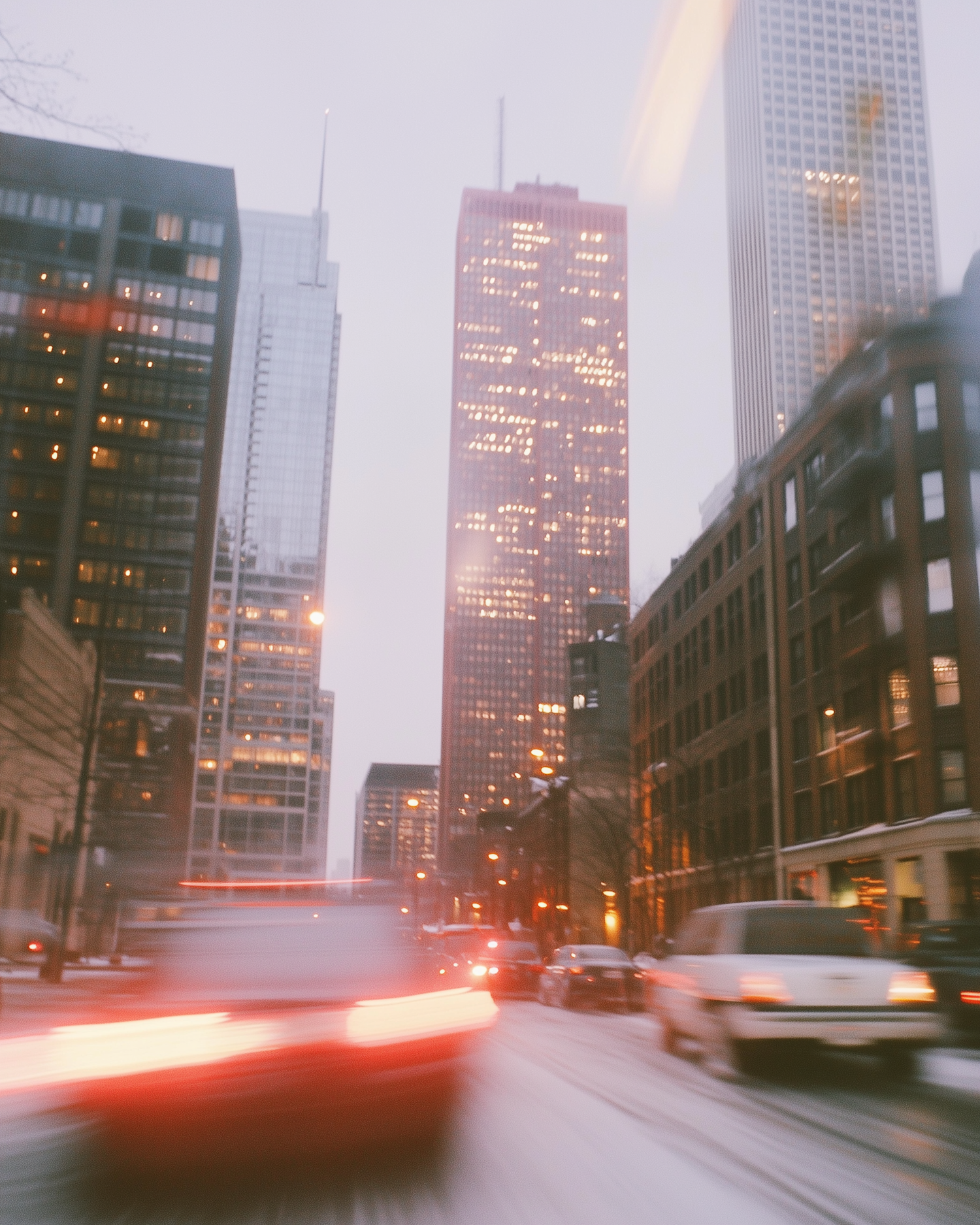 Dynamic cityscape with skyscrapers and blurred car lights on a snowy evening, capturing urban life and motion.