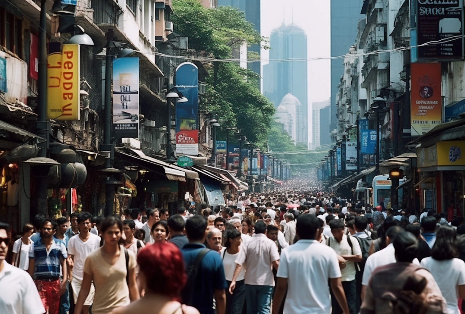 A crowded urban street with diverse people, old buildings, colorful banners, and modern skyscrapers in the background.