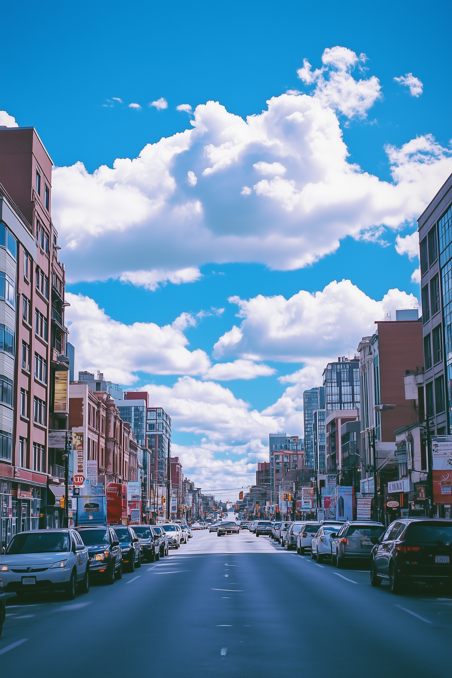 Vibrant city street with parked cars, diverse architecture, and a bright blue sky with fluffy clouds.