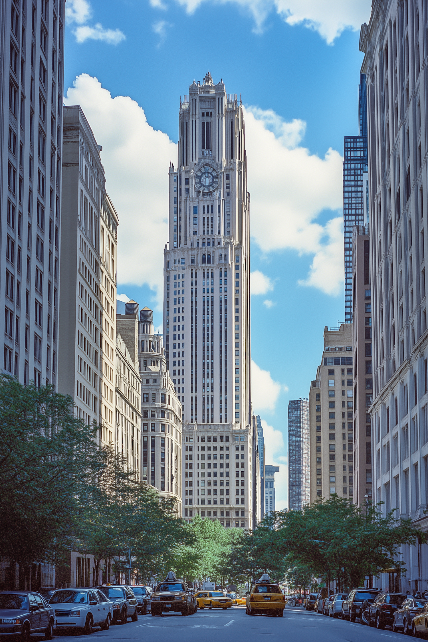 Iconic skyscraper with a clock face towers over a busy city street lined with cars and taxis under a bright blue sky.