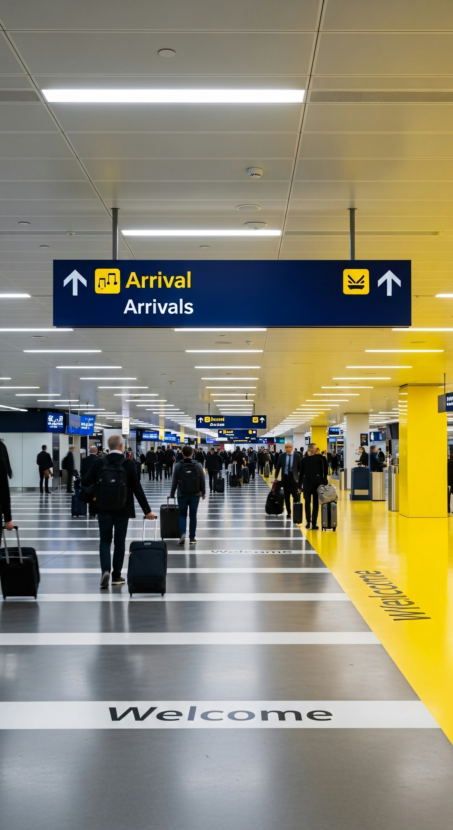 A bustling airport terminal with travelers heading to arrivals, marked by bright yellow and blue signage and a welcoming atmosphere.