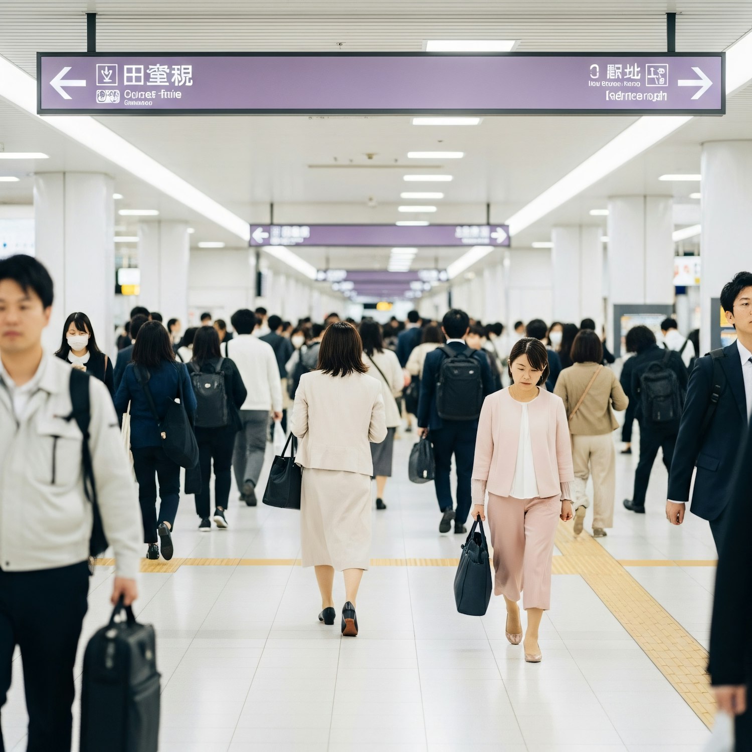 A bustling train station corridor with commuters walking in both directions under directional signs in Japanese and English.