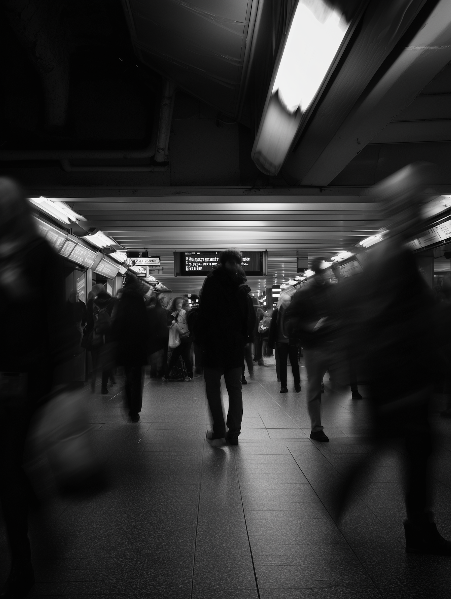 Black-and-white photo of a bustling underground station with people in motion and a digital signboard in the background.
