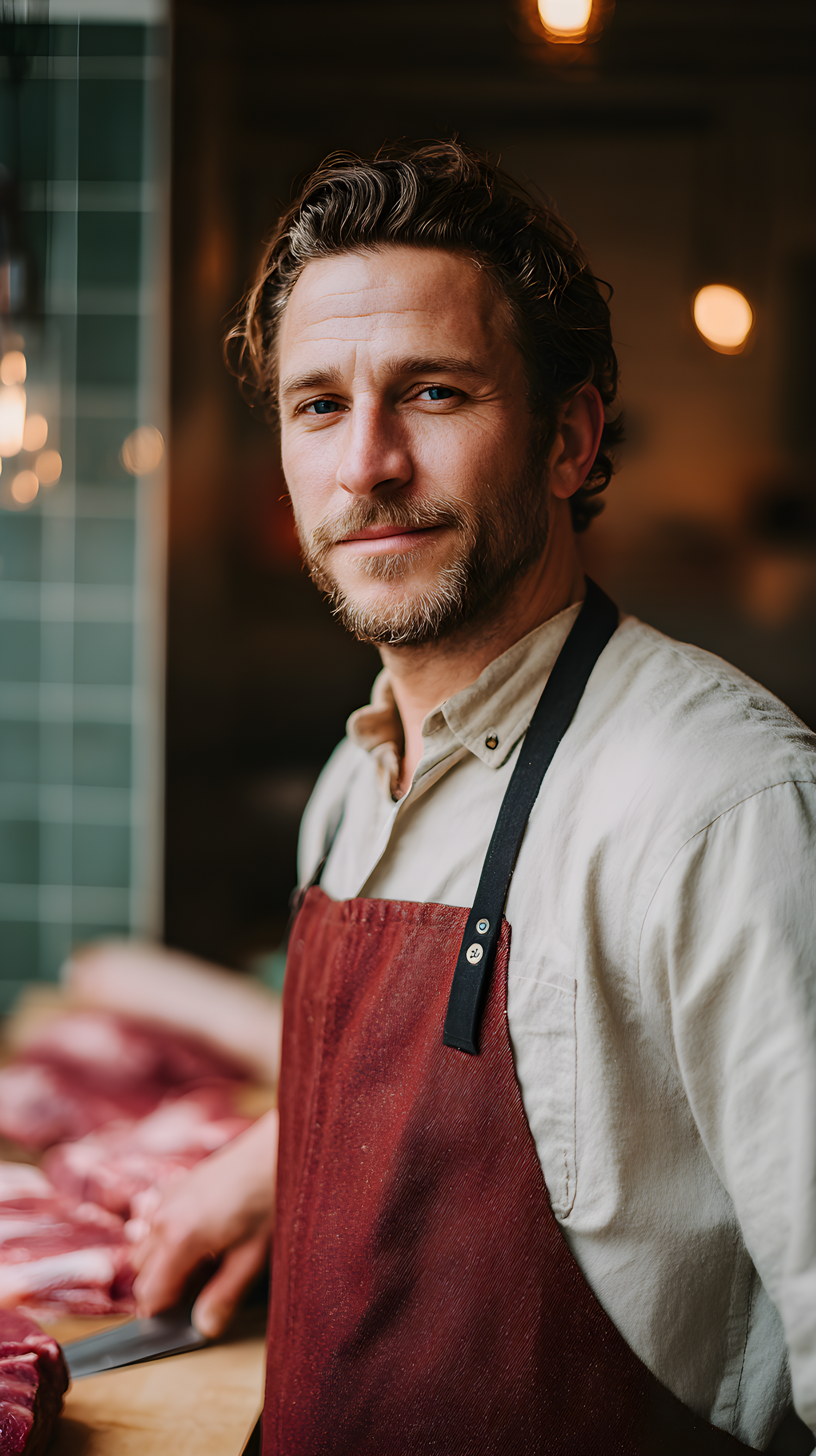 A butcher in a red apron stands confidently in a well-lit shop, with fresh cuts of meat on the counter and warm lighting in the background.