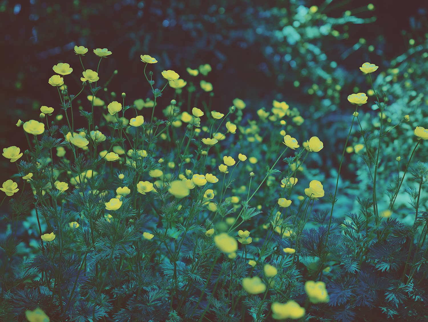 Yellow butterfly ranunculus flowers in a green garden create a vibrant and lively natural scene.
