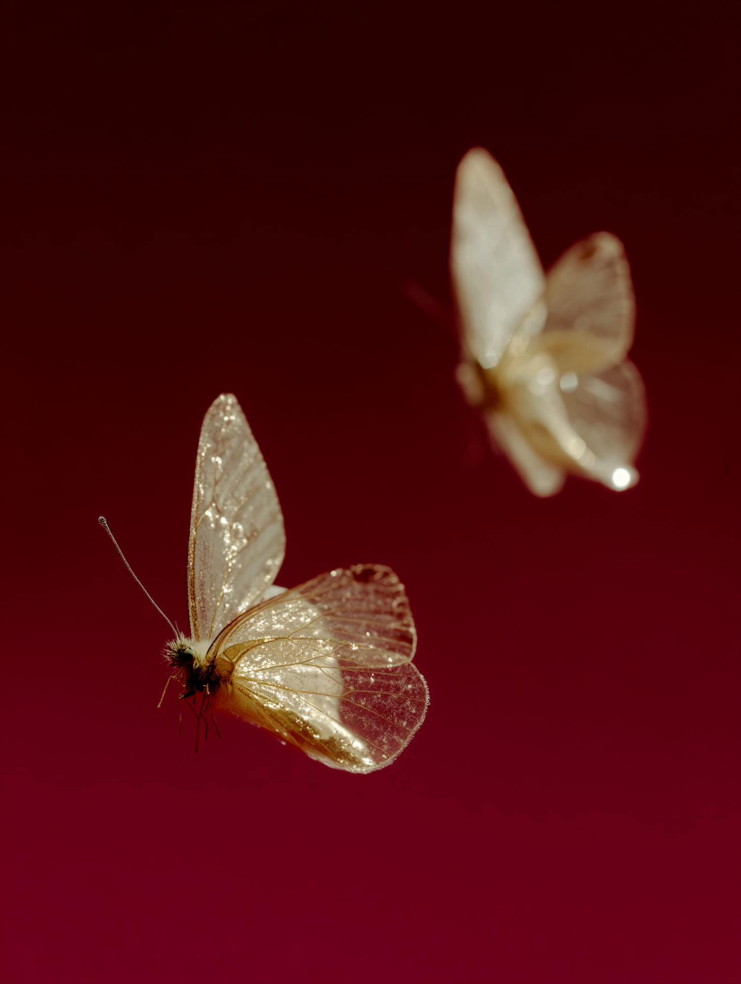 Two ethereal butterflies with translucent wings shimmer against a bold red gradient, showcasing their delicate forms in mid-flight.