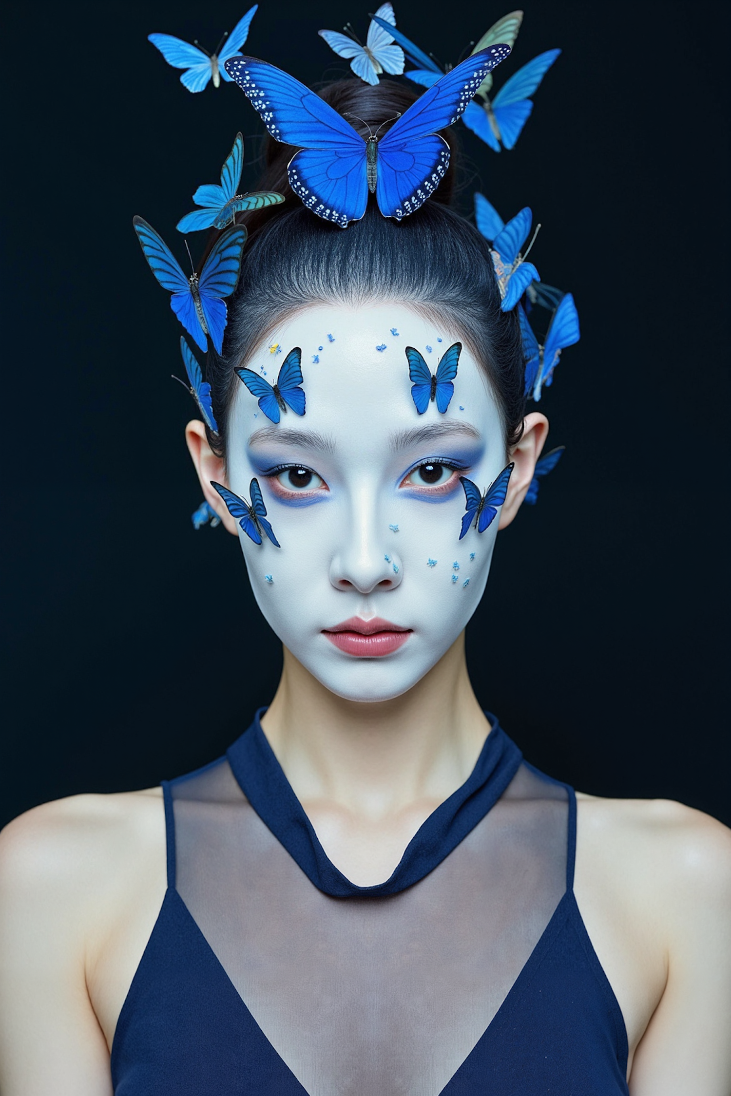 A woman with blue butterflies on her face and hair, wearing a dark blue top. Her serene expression and pale makeup create a mystical vibe.