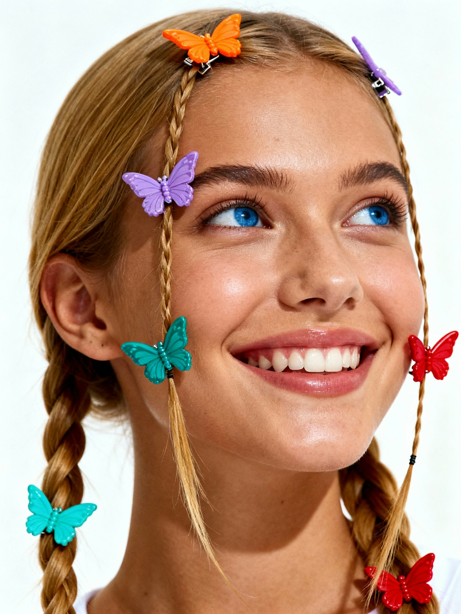 Studio portrait, plain white seamless background, soft even lighting, clean editorial aesthetic, no shadows, high detail, realistic photography, sharp focus on face and hair accessories Close-up of a smiling young woman with warm beige skin, honey blonde hair styled into two thin braids framing her face, bright blue eyes. She looks upward toward the right, expression joyful. Each braid is decorated with colorful butterfly hair clips in tones of orange, lilac, teal, and red, attached asymmetrically for a playful Y2K effect.