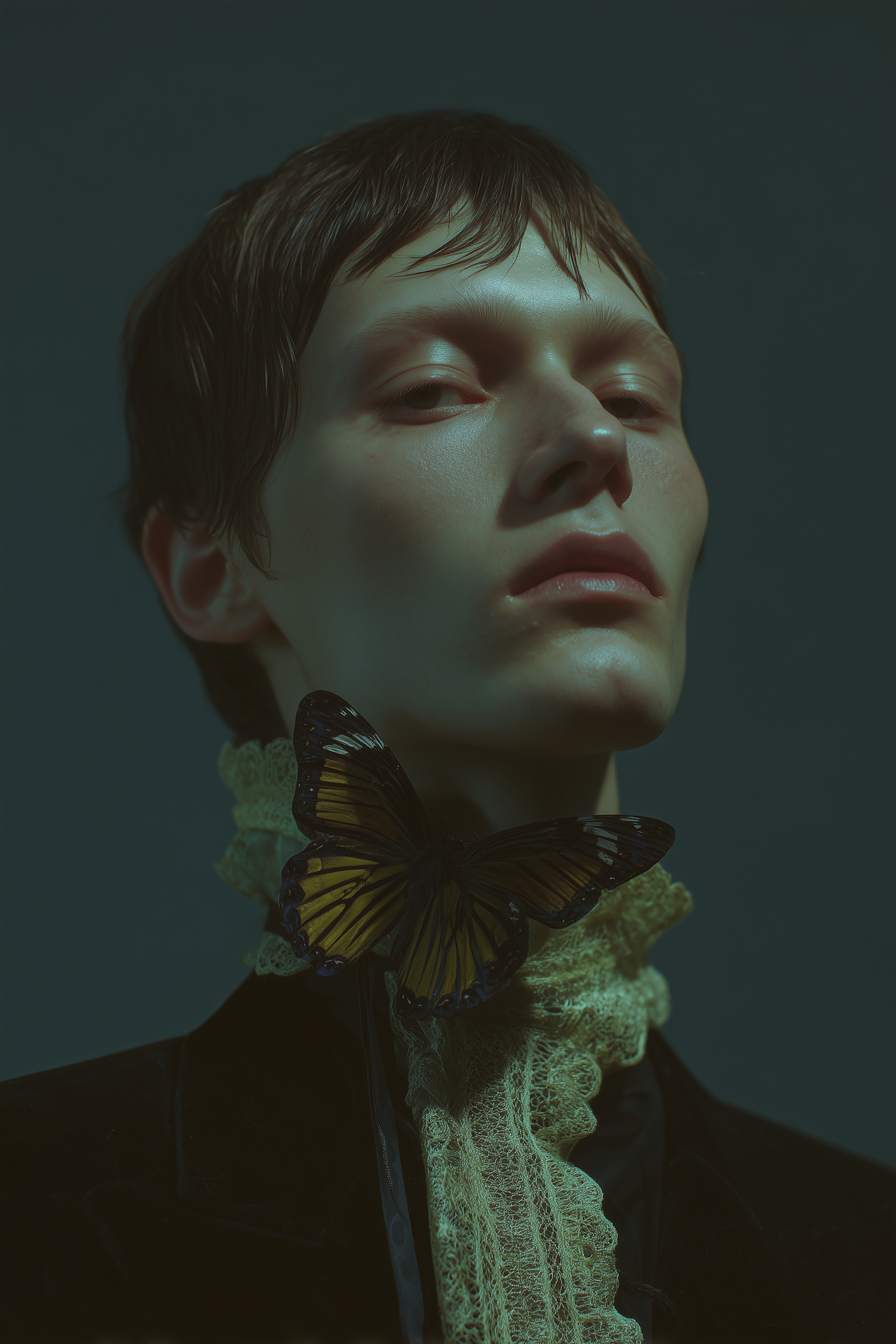 A moody portrait with elaborate lace, a butterfly accent, and captivating lighting, combining elegance with artistic depth.