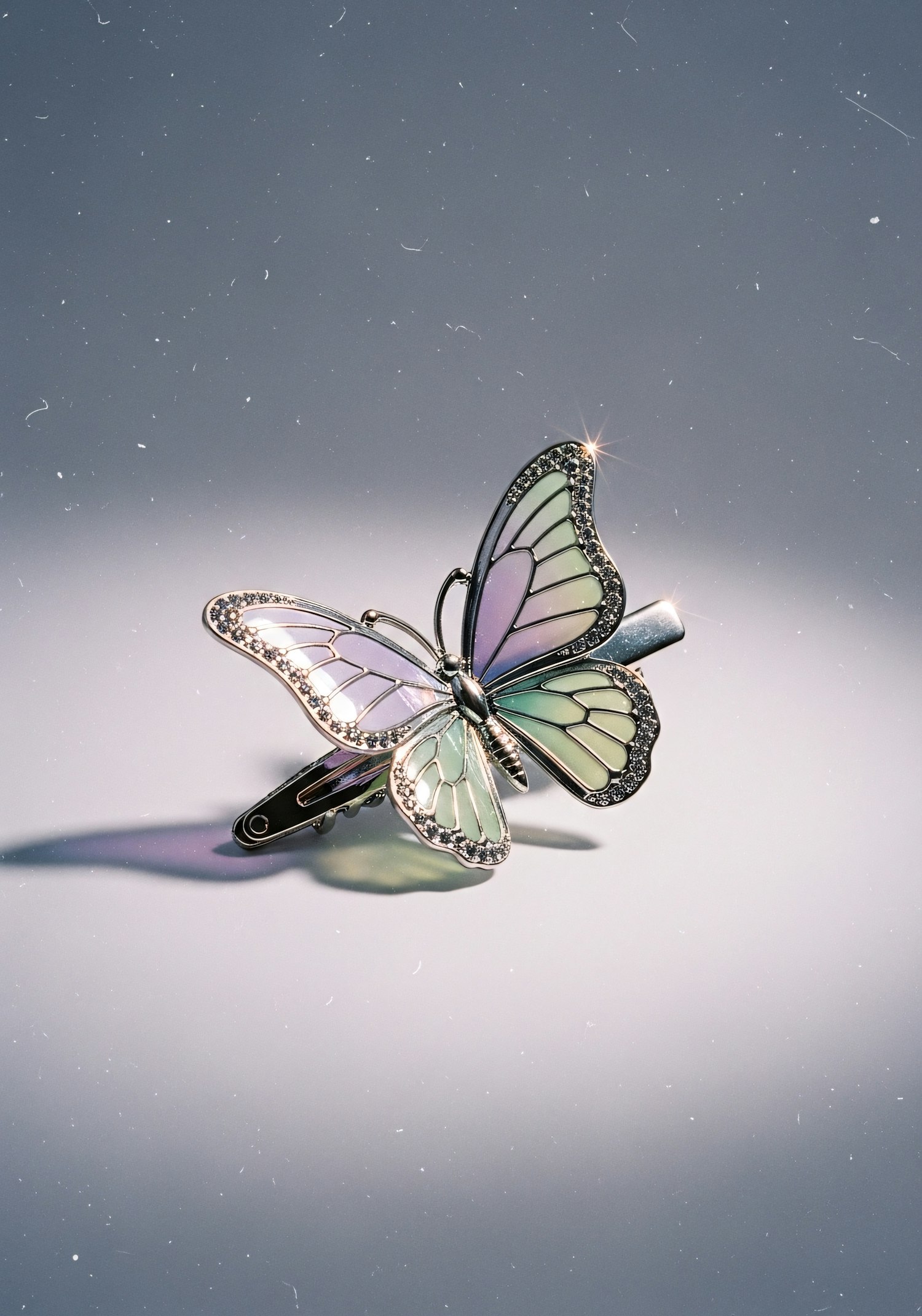A detailed butterfly-shaped hair clip with pastel colors and rhinestones, set against a soft gradient background.