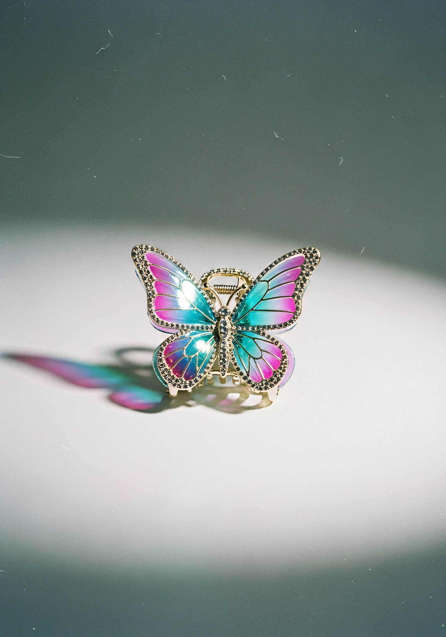 A vibrant butterfly-shaped hair clip with iridescent blue and pink wings, golden details, and rhinestones, set against a soft gray background.