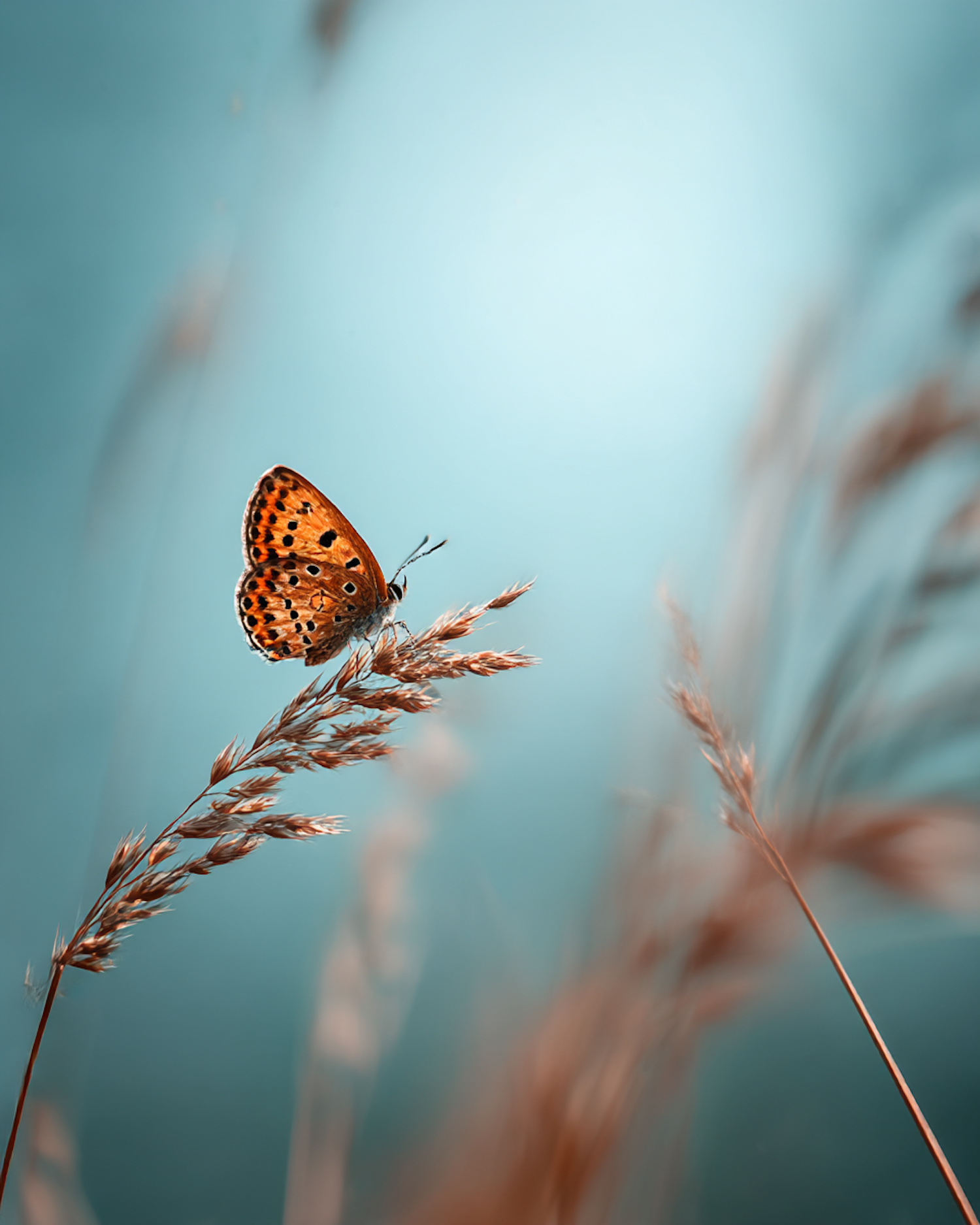 A close-up of an orange butterfly perched on a golden grass stalk against a soft teal background, showcasing nature's delicate beauty.
