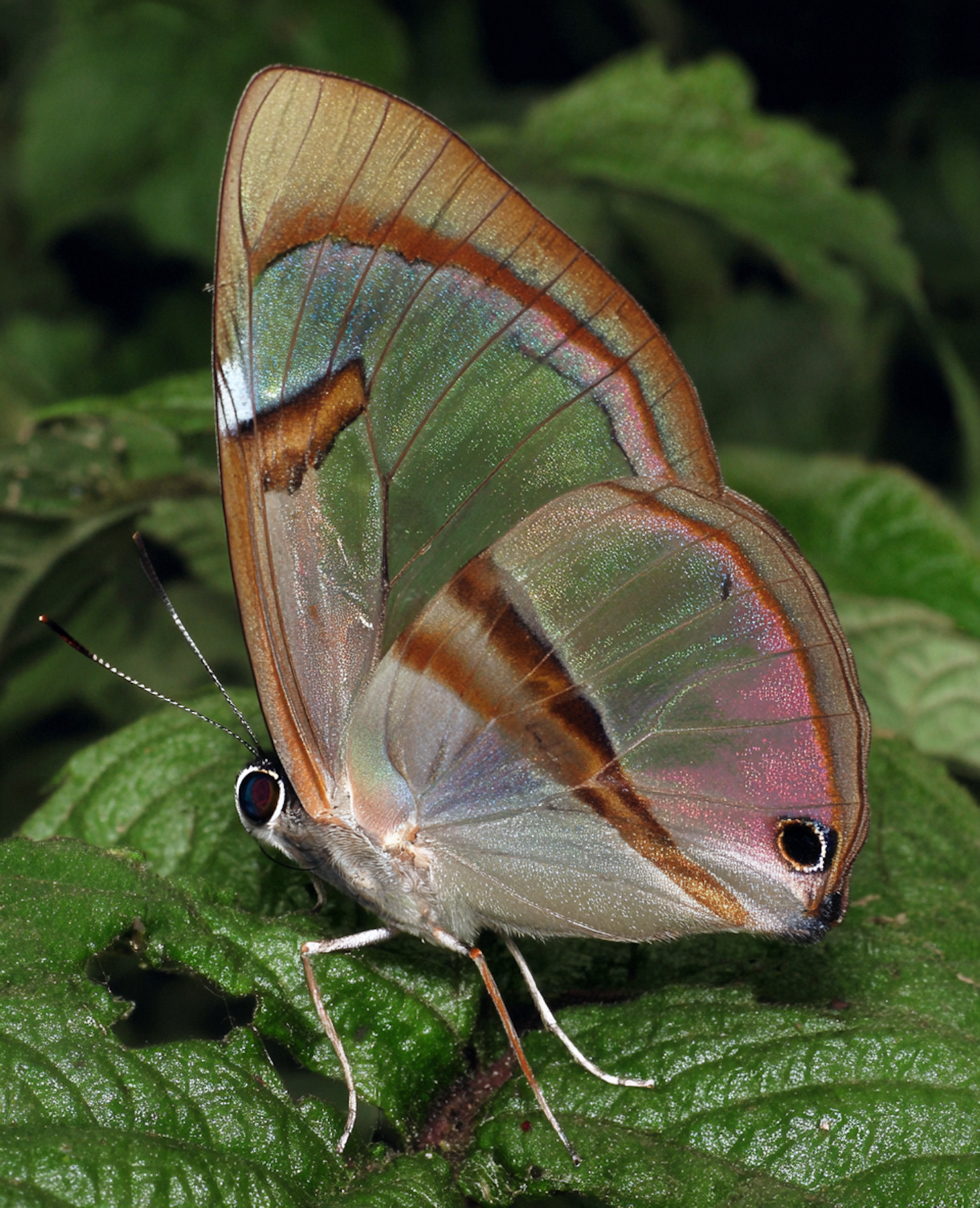 A stunning close-up of a butterfly with transparent, iridescent wings resting on a green leaf, showcasing its delicate beauty.