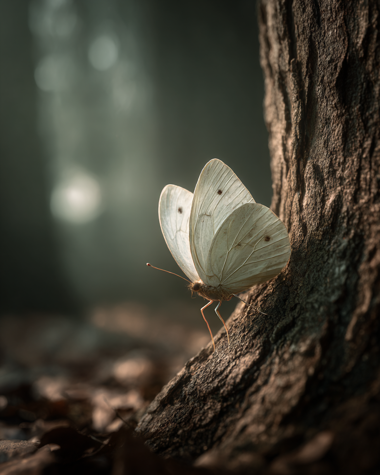 A serene close-up of a white butterfly perched on tree bark, with soft sunlight and a blurred forest background creating a tranquil scene.